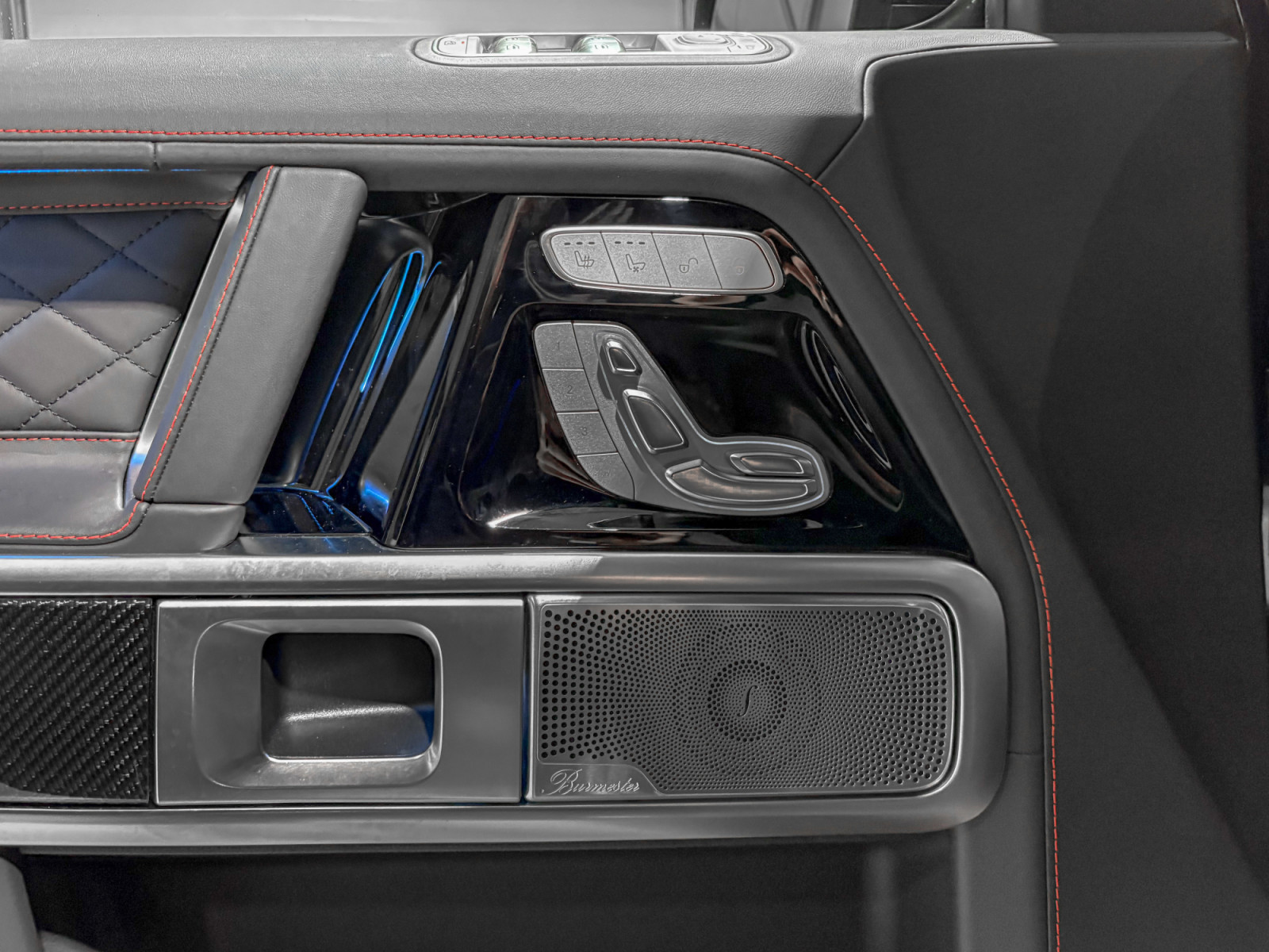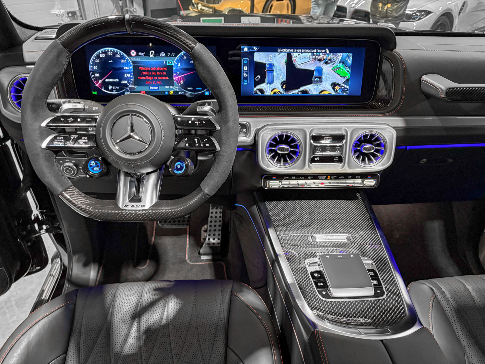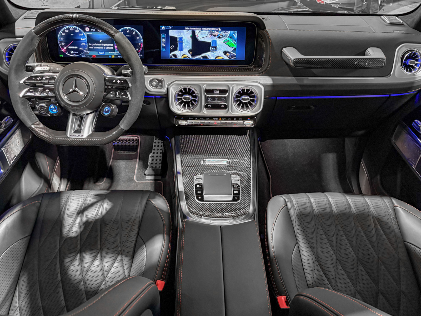 Système d'infodivertissement : Remote Services Premium, intérieur : garniture en carbone (AMG), pack confort, volant (AMG Performance, Carbon / Dinamica), jantes LM 10x22 (AMG, rayons croisés, noir mat), étoile Mercedes avant et arrière en noir , Pack Nuit (AMG), Pack Performance (AMG), lettrage et logo MB en noir - Extérieur, revêtement de siège/revêtement : cuir nappa MANUFAKTUR avec surpiqûres contrastées, Superior Intérieur, marchepieds latéraux (noirs), préparation autopartage, pack confort thermique