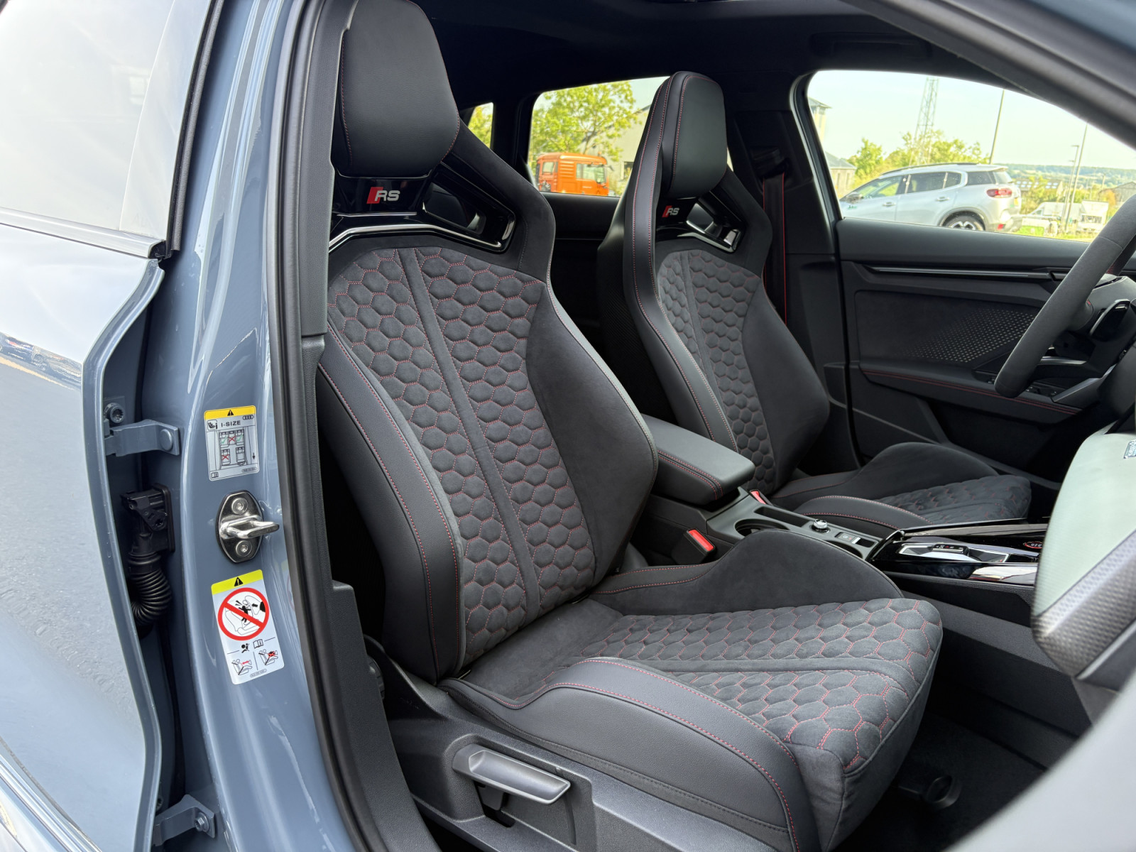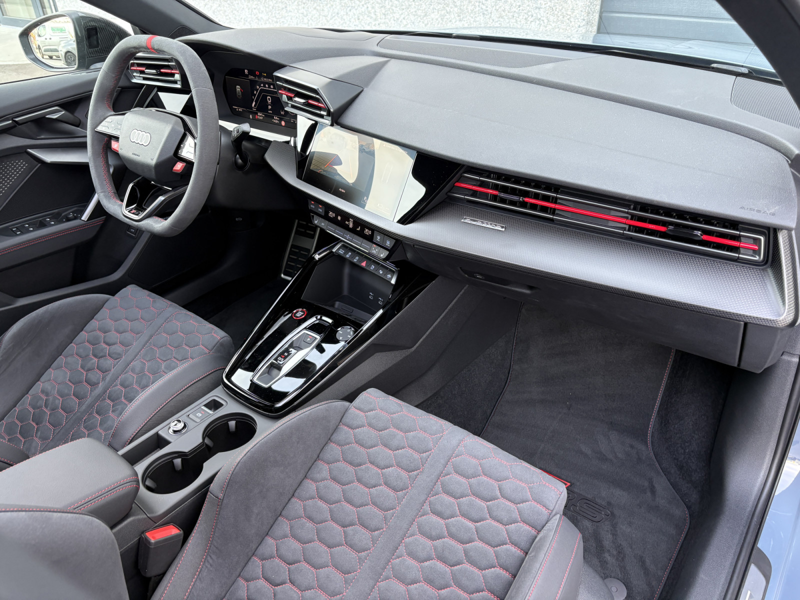 Airbags latéraux avant et système d'airbag de tête Prise en charge LTE pour Audi Phone Box Assistant de conduite adaptatif avec assistant d'urgence caméra de recul Audi connect Navigation et infodivertissement plus Audi Application Store et interface smartphone Inserts décoratifs et surfaces d'accentuation Carbon Atlas mat Combinaison microfibre Dinamica/cuir avec matelassage en nid d'abeille et lettrage RS dans le Phares Matrix LED, feux arrière LED et système de nettoyage des phares Caractéristiques extérieures de la RS en noir brillant