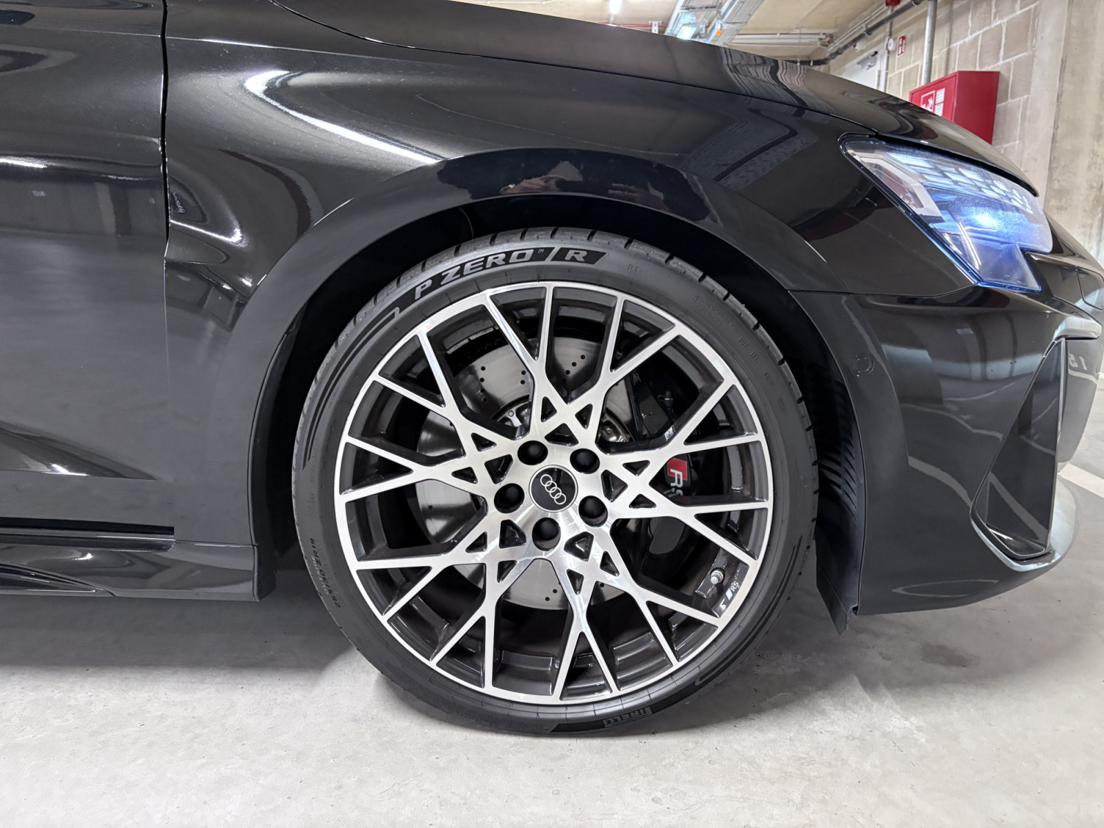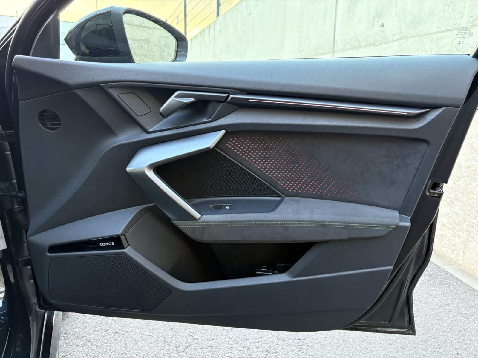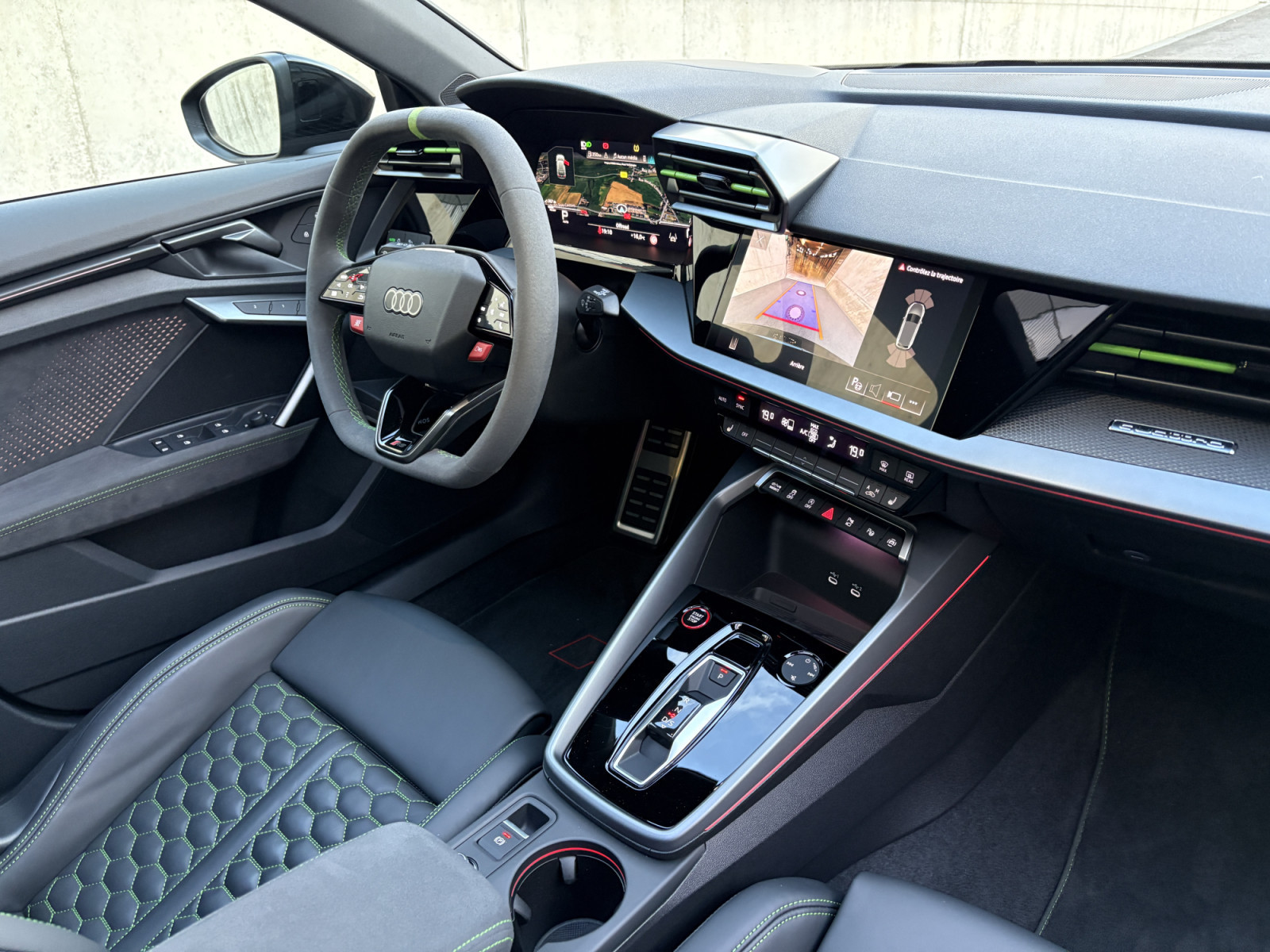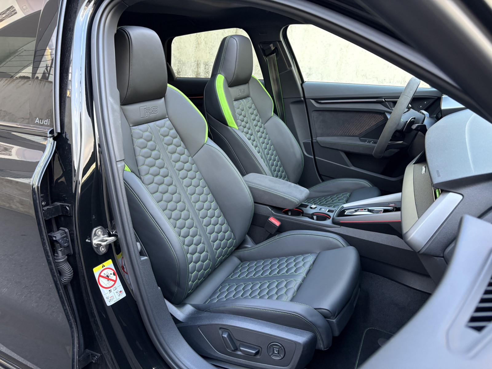 Pack rangement et coffre, Feu stop adaptatif, Airbag passager désactivable, Airbag conducteur/passager, Contrôle antipatinage (ASR) avec EDS, Audi connect (système d'appel d'urgence et d'assistance), Audi connect (télécommande), Audi Drive Select, Clignotants LED intégrés aux rétroviseurs extérieurs, Étriers de frein peints en noir, Ciel de pavillon en tissu noir, Becquet de toit, Seuils de porte avec inserts et inscriptions en aluminium, éclairés, Feux d'entrée à LED avec fonction de projection, Système d'assistance à la conduite : Détection de distraction et de fatigue, Système d'assistance à la conduite : Assistance à l'évitement, Système d'assistance à la conduite : Assistance au freinage (Audi pre sense front), Système d'assistance à la conduite : Assistance au freinage (collision consécutive), Système d'assistance à la conduite : Assistance d'urgence avec appel d'urgence automatique, Système d'assistance à la conduite : Assistance au stationnement, Système d'assistance à la conduite : Avertisseur de franchissement de ligne avec assistance d'urgence, Système d'assistance à la conduite : Reconnaissance des panneaux de signalisation, Système d'information du conducteur (FIS) avec écran couleur, Cache-bagages / store enrouleur, limiteur de vitesse, Feux arrière à LED avec clignotants dynamiques, Intérieur : Inserts décoratifs Carbon Atlas, Intérieur : Aspect Vanadium, Fixations Isofix pour siège enfant, carrosserie : 5 portes, verrouillage électrique enfant. combiné d'instruments numérique (virtual cockpit plus) au design RS, pack éclairage d'ambiance/contour (pro), système d'airbags de tête (sideguard), appuie-têtes arrière (3 voies), élargisseurs d'ailes, volant (sport/cuir - 3 branches, méplat en haut/en bas) avec multifonction et fonction de changement de vitesse, mise à jour du modèle, moteur 2,5 litres - 294 kW 20V TFSI, pack non-fumeur, pack style noir, pack style noir plus, frein de stationnement électromécanique, pédales en acier inoxydable, direction progressive, réception radio numérique (DAB), kit de réparation de pneus, pack extérieur RS noir mat, pare-chocs avant RS design sport, sièges sport RS à l'avant, dossier de banquette arrière divisé/rabattable (40:20:40), faibles émissions selon la norme antipollution Euro 6e, levier de vitesses/sélecteur de vitesse en Alcantara/microfibre, airbag latéral à l'avant, airbag latéral au centre avant (airbag d'interaction), suspension sport spécifique S/RS, système start/stop, prise de courant (connexion 12 V) à l'arrière (console centrale), pare-chocs Sport Design (S-line), pare-chocs Sport Design avec insert diffuseur arrière, inserts de garniture de porte en Alcantara, interface Bluetooth universelle, interface USB pour les passagers arrière