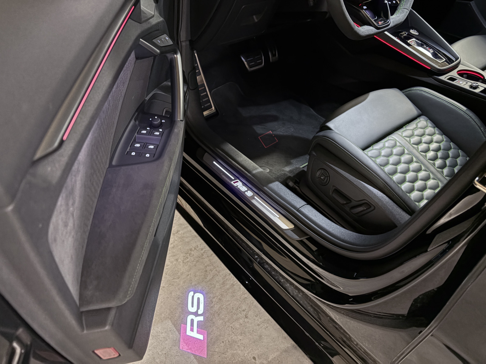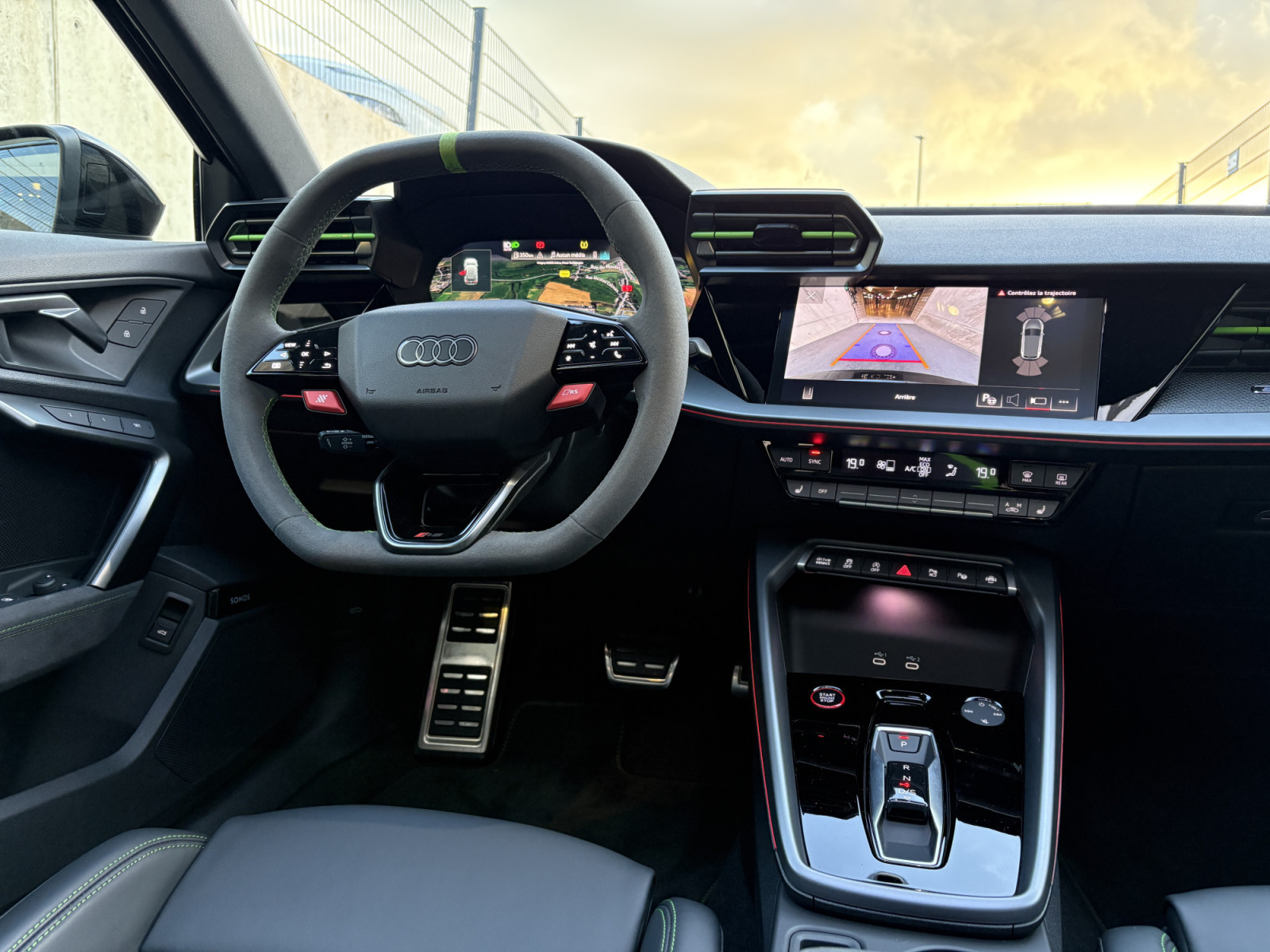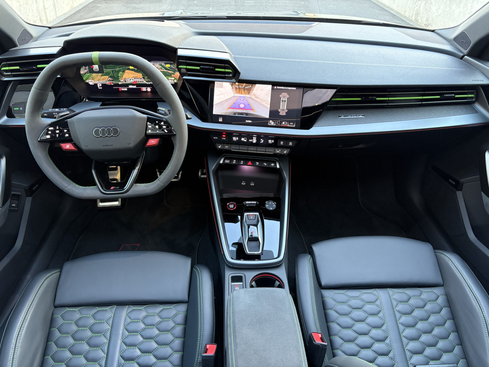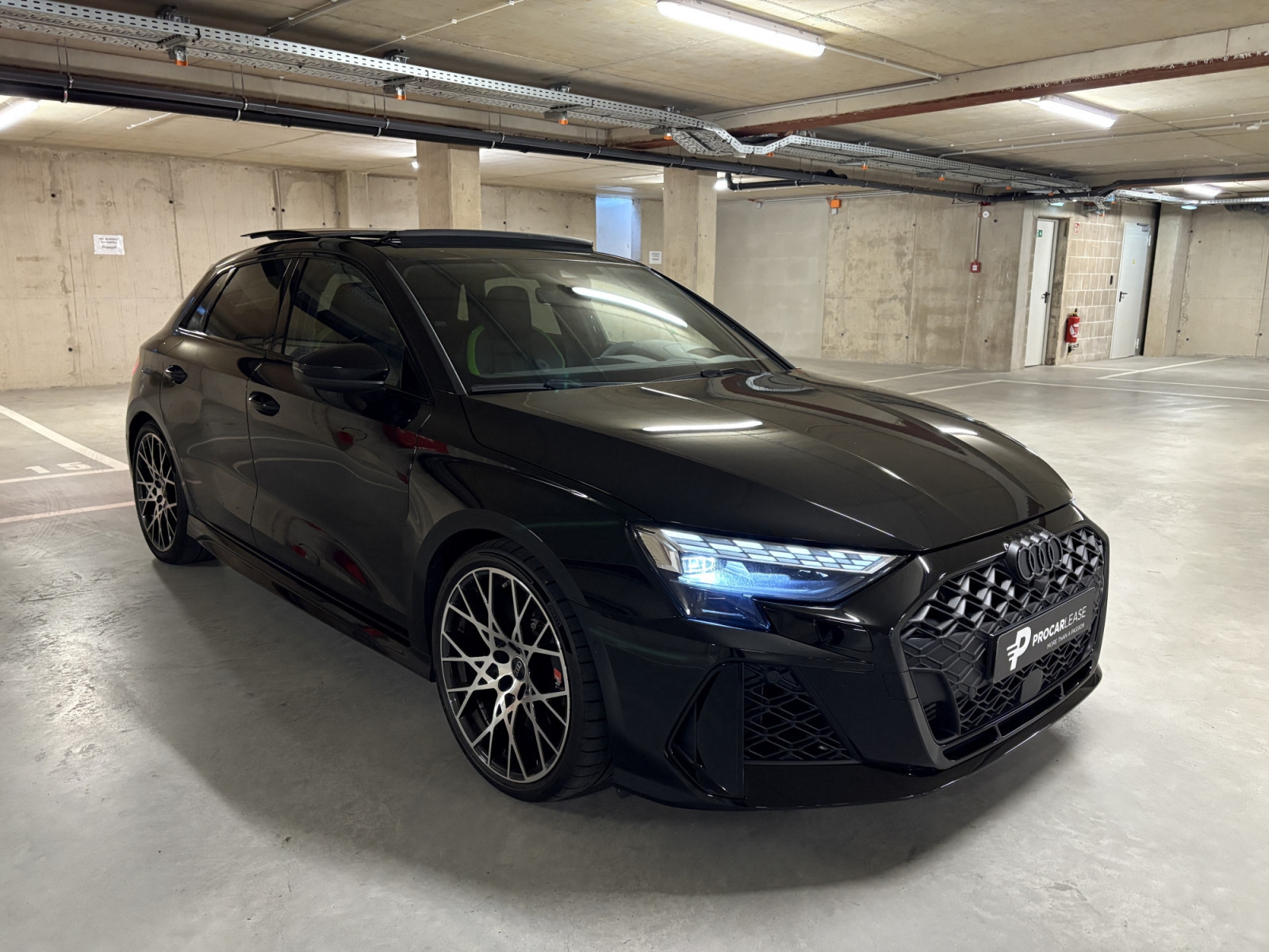 Pack rangement et coffre, Feu stop adaptatif, Airbag passager désactivable, Airbag conducteur/passager, Contrôle antipatinage (ASR) avec EDS, Audi connect (système d'appel d'urgence et d'assistance), Audi connect (télécommande), Audi Drive Select, Clignotants LED intégrés aux rétroviseurs extérieurs, Étriers de frein peints en noir, Ciel de pavillon en tissu noir, Becquet de toit, Seuils de porte avec inserts et inscriptions en aluminium, éclairés, Feux d'entrée à LED avec fonction de projection, Système d'assistance à la conduite : Détection de distraction et de fatigue, Système d'assistance à la conduite : Assistance à l'évitement, Système d'assistance à la conduite : Assistance au freinage (Audi pre sense front), Système d'assistance à la conduite : Assistance au freinage (collision consécutive), Système d'assistance à la conduite : Assistance d'urgence avec appel d'urgence automatique, Système d'assistance à la conduite : Assistance au stationnement, Système d'assistance à la conduite : Avertisseur de franchissement de ligne avec assistance d'urgence, Système d'assistance à la conduite : Reconnaissance des panneaux de signalisation, Système d'information du conducteur (FIS) avec écran couleur, Cache-bagages / store enrouleur, limiteur de vitesse, Feux arrière à LED avec clignotants dynamiques, Intérieur : Inserts décoratifs Carbon Atlas, Intérieur : Aspect Vanadium, Fixations Isofix pour siège enfant, carrosserie : 5 portes, verrouillage électrique enfant. combiné d'instruments numérique (virtual cockpit plus) au design RS, pack éclairage d'ambiance/contour (pro), système d'airbags de tête (sideguard), appuie-têtes arrière (3 voies), élargisseurs d'ailes, volant (sport/cuir - 3 branches, méplat en haut/en bas) avec multifonction et fonction de changement de vitesse, mise à jour du modèle, moteur 2,5 litres - 294 kW 20V TFSI, pack non-fumeur, pack style noir, pack style noir plus, frein de stationnement électromécanique, pédales en acier inoxydable, direction progressive, réception radio numérique (DAB), kit de réparation de pneus, pack extérieur RS noir mat, pare-chocs avant RS design sport, sièges sport RS à l'avant, dossier de banquette arrière divisé/rabattable (40:20:40), faibles émissions selon la norme antipollution Euro 6e, levier de vitesses/sélecteur de vitesse en Alcantara/microfibre, airbag latéral à l'avant, airbag latéral au centre avant (airbag d'interaction), suspension sport spécifique S/RS, système start/stop, prise de courant (connexion 12 V) à l'arrière (console centrale), pare-chocs Sport Design (S-line), pare-chocs Sport Design avec insert diffuseur arrière, inserts de garniture de porte en Alcantara, interface Bluetooth universelle, interface USB pour les passagers arrière