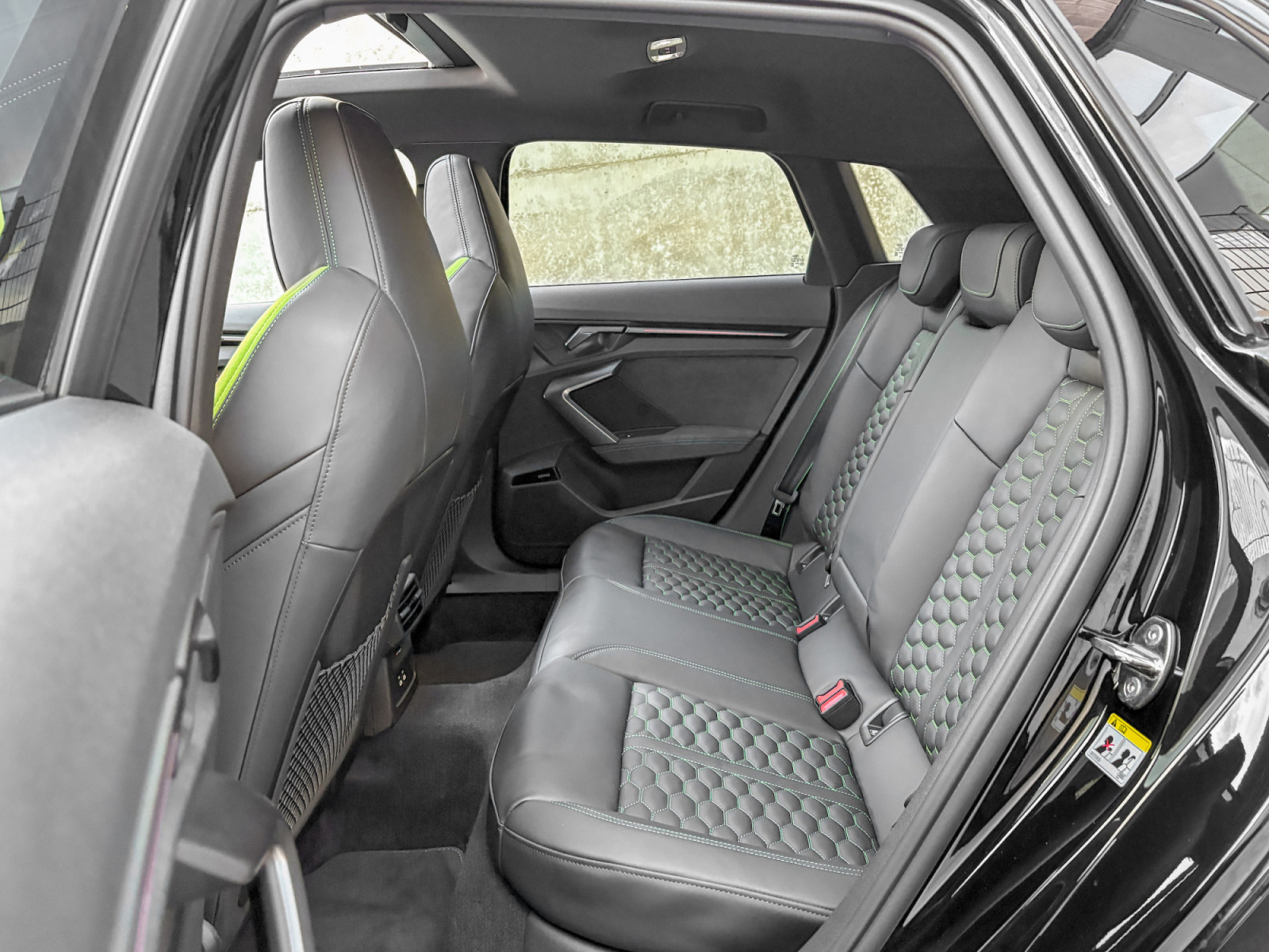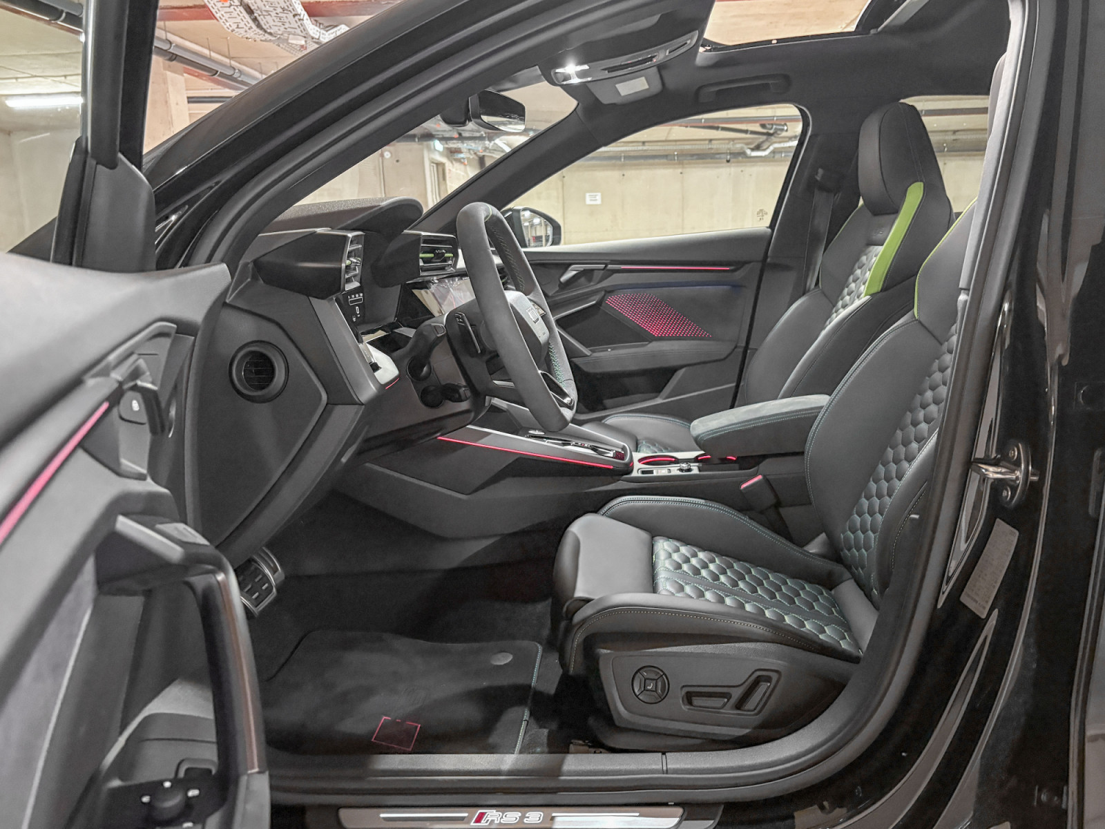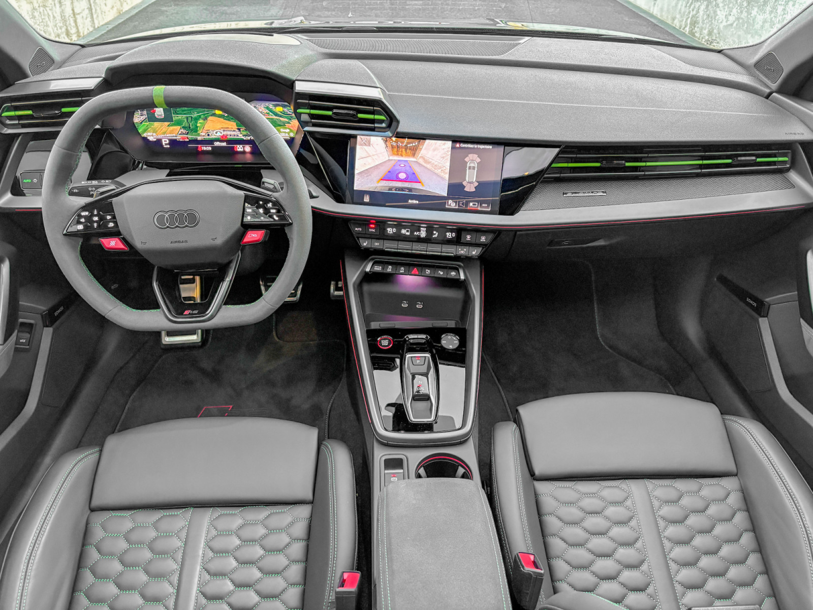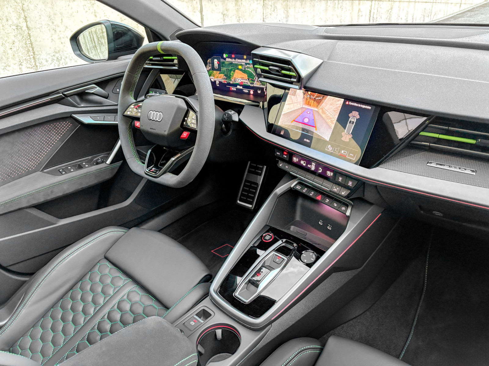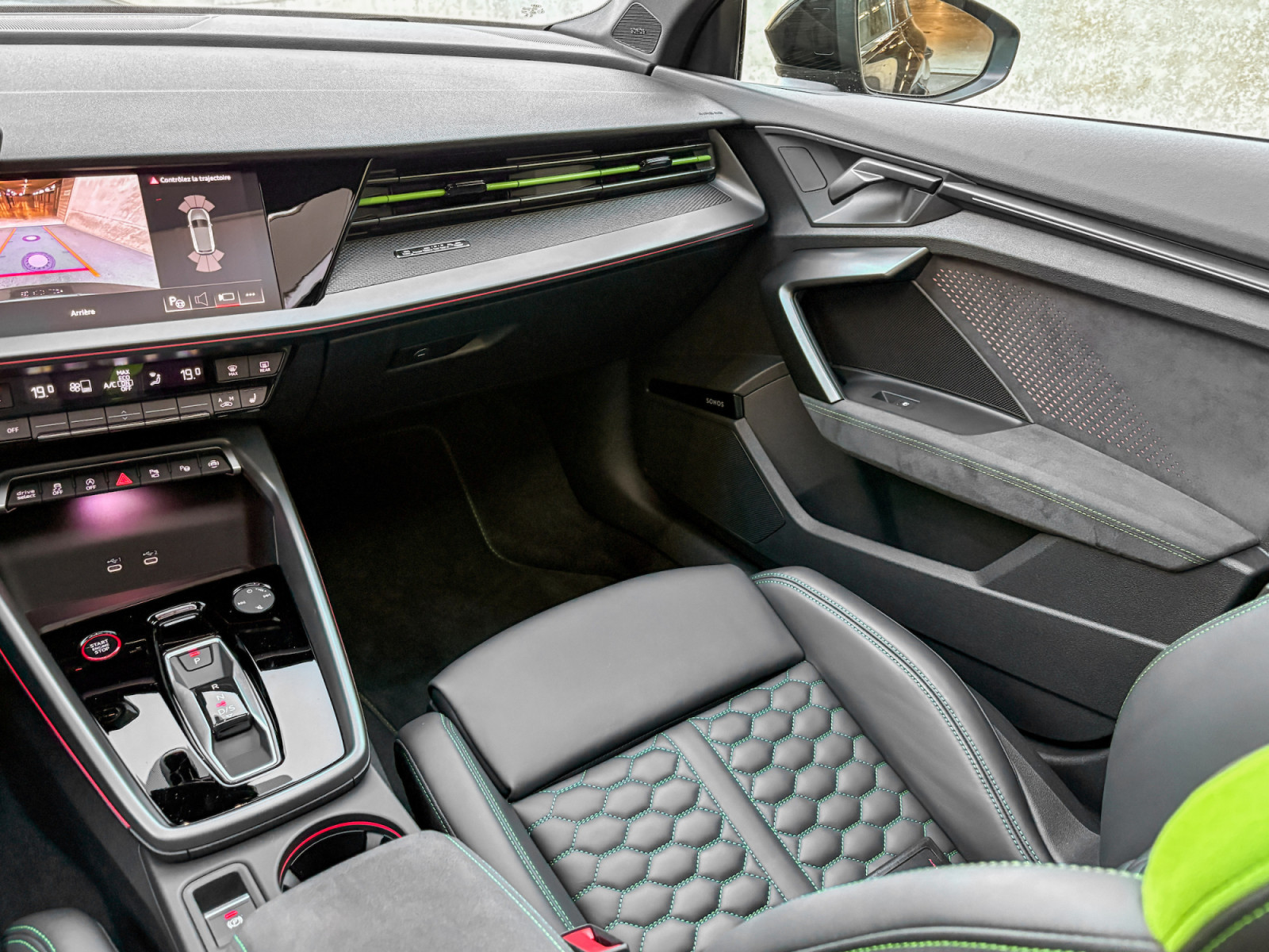 Pack rangement et coffre, Feu stop adaptatif, Airbag passager désactivable, Airbag conducteur/passager, Contrôle antipatinage (ASR) avec EDS, Audi connect (système d'appel d'urgence et d'assistance), Audi connect (télécommande), Audi Drive Select, Clignotants LED intégrés aux rétroviseurs extérieurs, Étriers de frein peints en noir, Ciel de pavillon en tissu noir, Becquet de toit, Seuils de porte avec inserts et inscriptions en aluminium, éclairés, Feux d'entrée à LED avec fonction de projection, Système d'assistance à la conduite : Détection de distraction et de fatigue, Système d'assistance à la conduite : Assistance à l'évitement, Système d'assistance à la conduite : Assistance au freinage (Audi pre sense front), Système d'assistance à la conduite : Assistance au freinage (collision consécutive), Système d'assistance à la conduite : Assistance d'urgence avec appel d'urgence automatique, Système d'assistance à la conduite : Assistance au stationnement, Système d'assistance à la conduite : Avertisseur de franchissement de ligne avec assistance d'urgence, Système d'assistance à la conduite : Reconnaissance des panneaux de signalisation, Système d'information du conducteur (FIS) avec écran couleur, Cache-bagages / store enrouleur, limiteur de vitesse, Feux arrière à LED avec clignotants dynamiques, Intérieur : Inserts décoratifs Carbon Atlas, Intérieur : Aspect Vanadium, Fixations Isofix pour siège enfant, carrosserie : 5 portes, verrouillage électrique enfant. combiné d'instruments numérique (virtual cockpit plus) au design RS, pack éclairage d'ambiance/contour (pro), système d'airbags de tête (sideguard), appuie-têtes arrière (3 voies), élargisseurs d'ailes, volant (sport/cuir - 3 branches, méplat en haut/en bas) avec multifonction et fonction de changement de vitesse, mise à jour du modèle, moteur 2,5 litres - 294 kW 20V TFSI, pack non-fumeur, pack style noir, pack style noir plus, frein de stationnement électromécanique, pédales en acier inoxydable, direction progressive, réception radio numérique (DAB), kit de réparation de pneus, pack extérieur RS noir mat, pare-chocs avant RS design sport, sièges sport RS à l'avant, dossier de banquette arrière divisé/rabattable (40:20:40), faibles émissions selon la norme antipollution Euro 6e, levier de vitesses/sélecteur de vitesse en Alcantara/microfibre, airbag latéral à l'avant, airbag latéral au centre avant (airbag d'interaction), suspension sport spécifique S/RS, système start/stop, prise de courant (connexion 12 V) à l'arrière (console centrale), pare-chocs Sport Design (S-line), pare-chocs Sport Design avec insert diffuseur arrière, inserts de garniture de porte en Alcantara, interface Bluetooth universelle, interface USB pour les passagers arrière