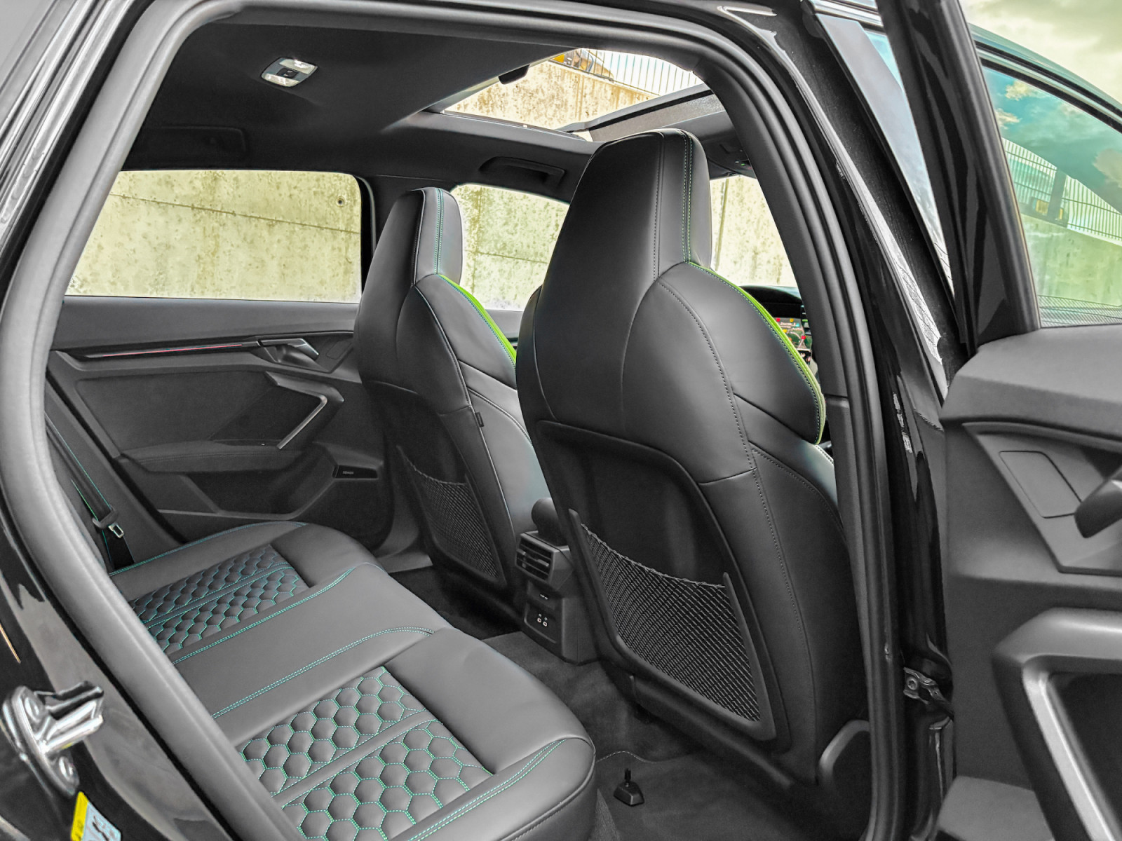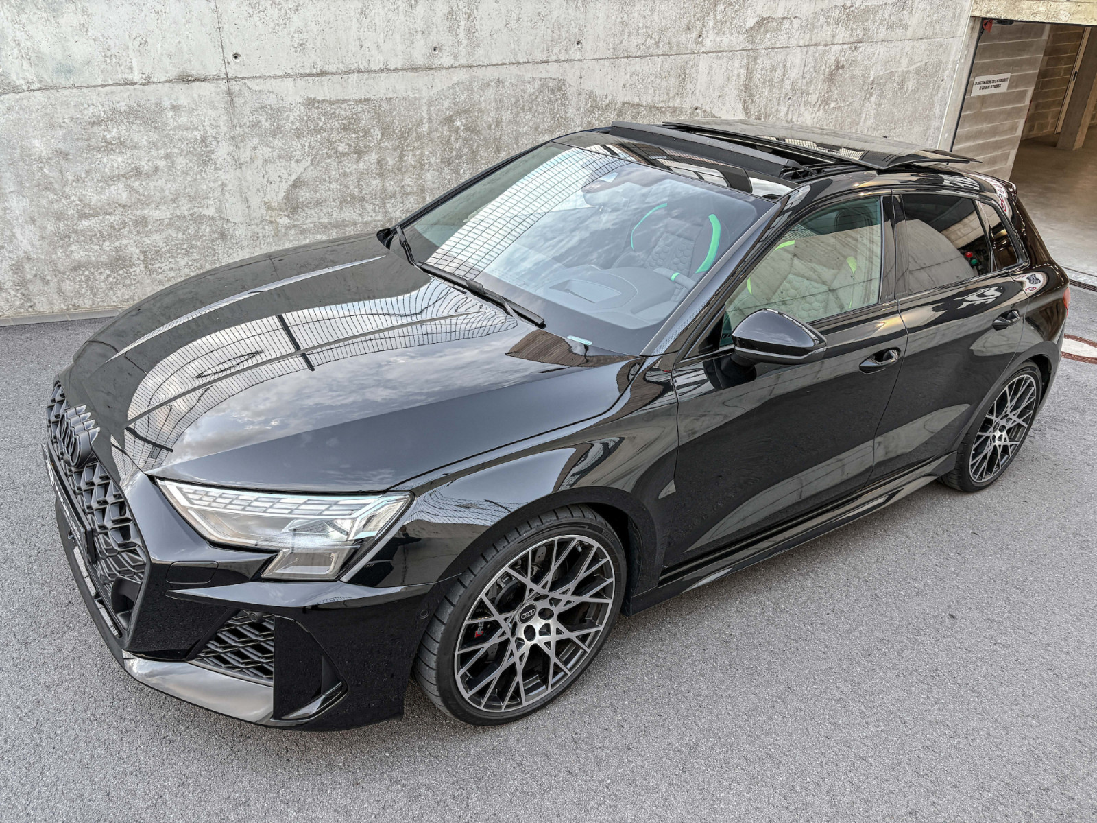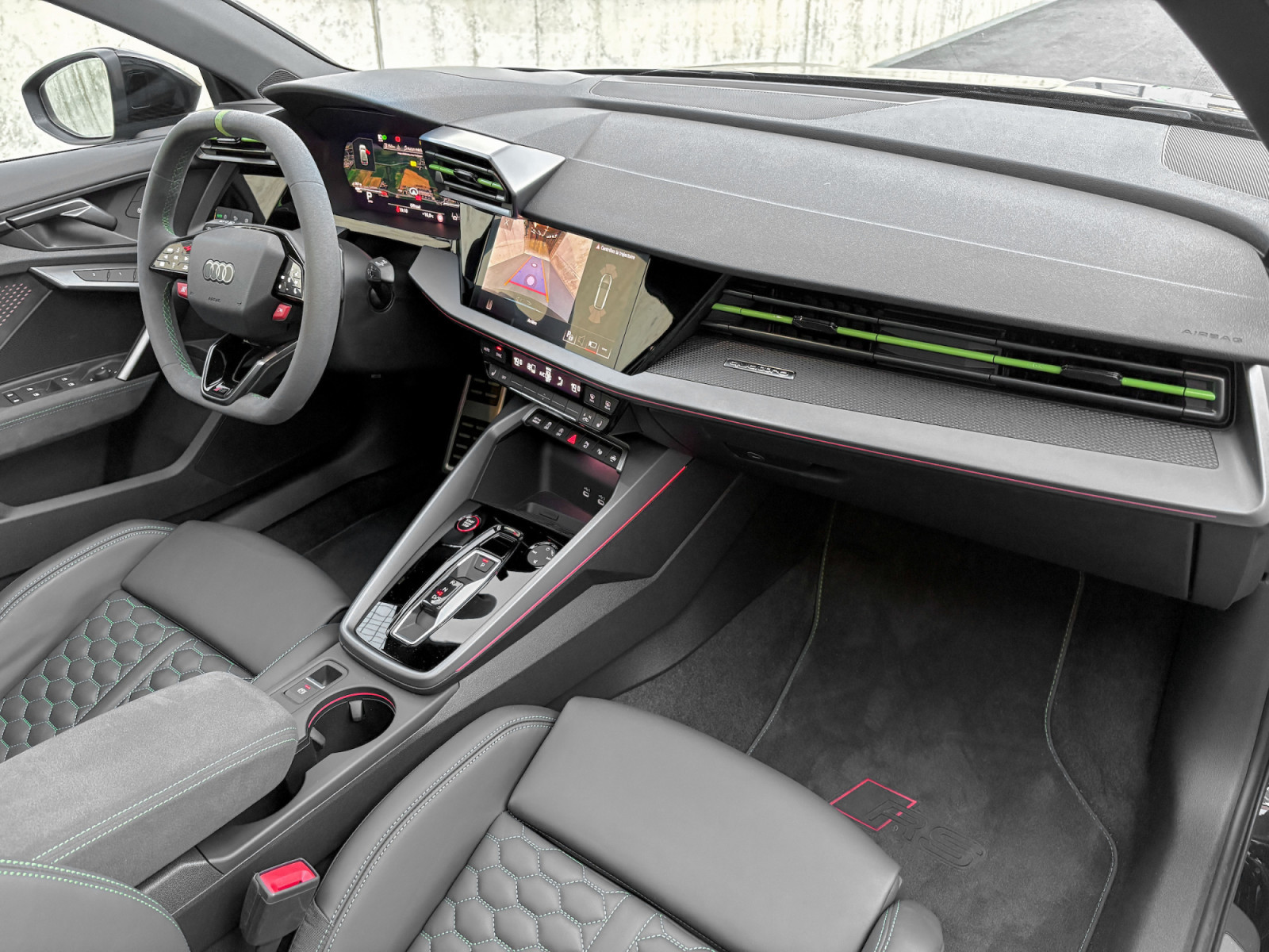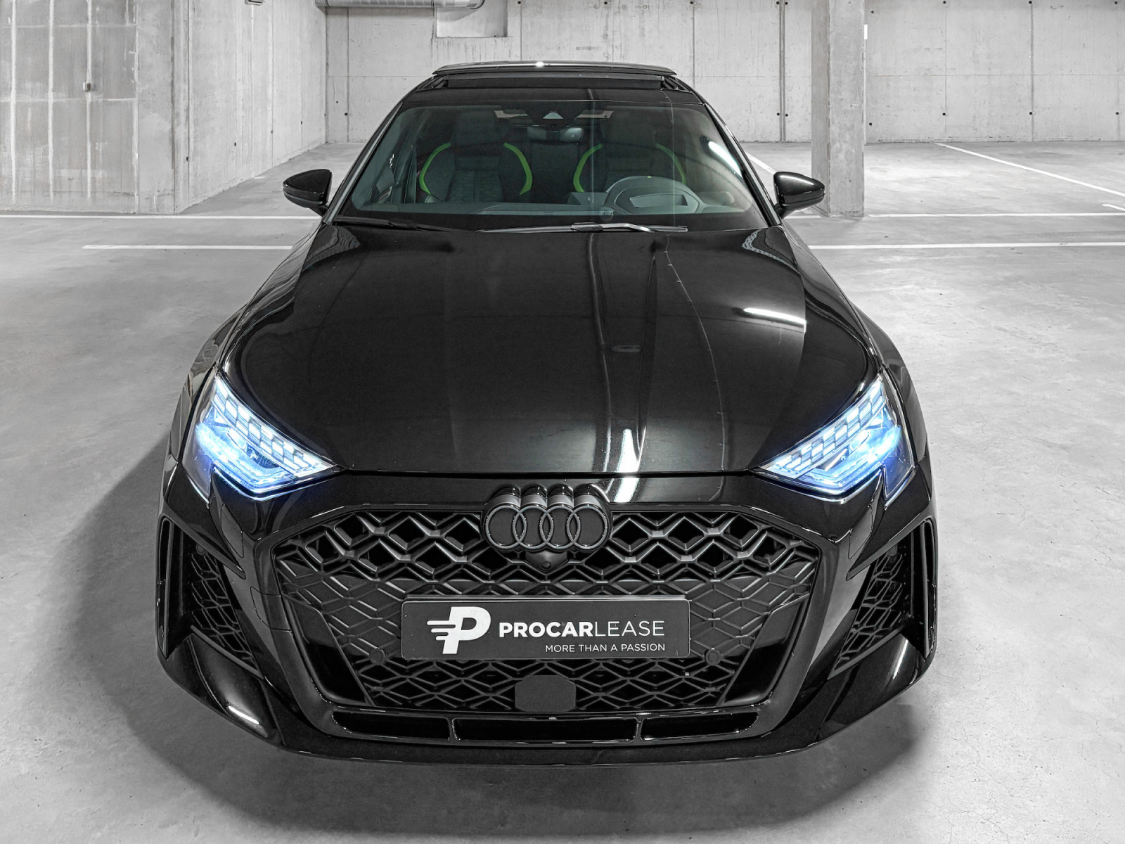 Pack rangement et coffre, Feu stop adaptatif, Airbag passager désactivable, Airbag conducteur/passager, Contrôle antipatinage (ASR) avec EDS, Audi connect (système d'appel d'urgence et d'assistance), Audi connect (télécommande), Audi Drive Select, Clignotants LED intégrés aux rétroviseurs extérieurs, Étriers de frein peints en noir, Ciel de pavillon en tissu noir, Becquet de toit, Seuils de porte avec inserts et inscriptions en aluminium, éclairés, Feux d'entrée à LED avec fonction de projection, Système d'assistance à la conduite : Détection de distraction et de fatigue, Système d'assistance à la conduite : Assistance à l'évitement, Système d'assistance à la conduite : Assistance au freinage (Audi pre sense front), Système d'assistance à la conduite : Assistance au freinage (collision consécutive), Système d'assistance à la conduite : Assistance d'urgence avec appel d'urgence automatique, Système d'assistance à la conduite : Assistance au stationnement, Système d'assistance à la conduite : Avertisseur de franchissement de ligne avec assistance d'urgence, Système d'assistance à la conduite : Reconnaissance des panneaux de signalisation, Système d'information du conducteur (FIS) avec écran couleur, Cache-bagages / store enrouleur, limiteur de vitesse, Feux arrière à LED avec clignotants dynamiques, Intérieur : Inserts décoratifs Carbon Atlas, Intérieur : Aspect Vanadium, Fixations Isofix pour siège enfant, carrosserie : 5 portes, verrouillage électrique enfant. combiné d'instruments numérique (virtual cockpit plus) au design RS, pack éclairage d'ambiance/contour (pro), système d'airbags de tête (sideguard), appuie-têtes arrière (3 voies), élargisseurs d'ailes, volant (sport/cuir - 3 branches, méplat en haut/en bas) avec multifonction et fonction de changement de vitesse, mise à jour du modèle, moteur 2,5 litres - 294 kW 20V TFSI, pack non-fumeur, pack style noir, pack style noir plus, frein de stationnement électromécanique, pédales en acier inoxydable, direction progressive, réception radio numérique (DAB), kit de réparation de pneus, pack extérieur RS noir mat, pare-chocs avant RS design sport, sièges sport RS à l'avant, dossier de banquette arrière divisé/rabattable (40:20:40), faibles émissions selon la norme antipollution Euro 6e, levier de vitesses/sélecteur de vitesse en Alcantara/microfibre, airbag latéral à l'avant, airbag latéral au centre avant (airbag d'interaction), suspension sport spécifique S/RS, système start/stop, prise de courant (connexion 12 V) à l'arrière (console centrale), pare-chocs Sport Design (S-line), pare-chocs Sport Design avec insert diffuseur arrière, inserts de garniture de porte en Alcantara, interface Bluetooth universelle, interface USB pour les passagers arrière