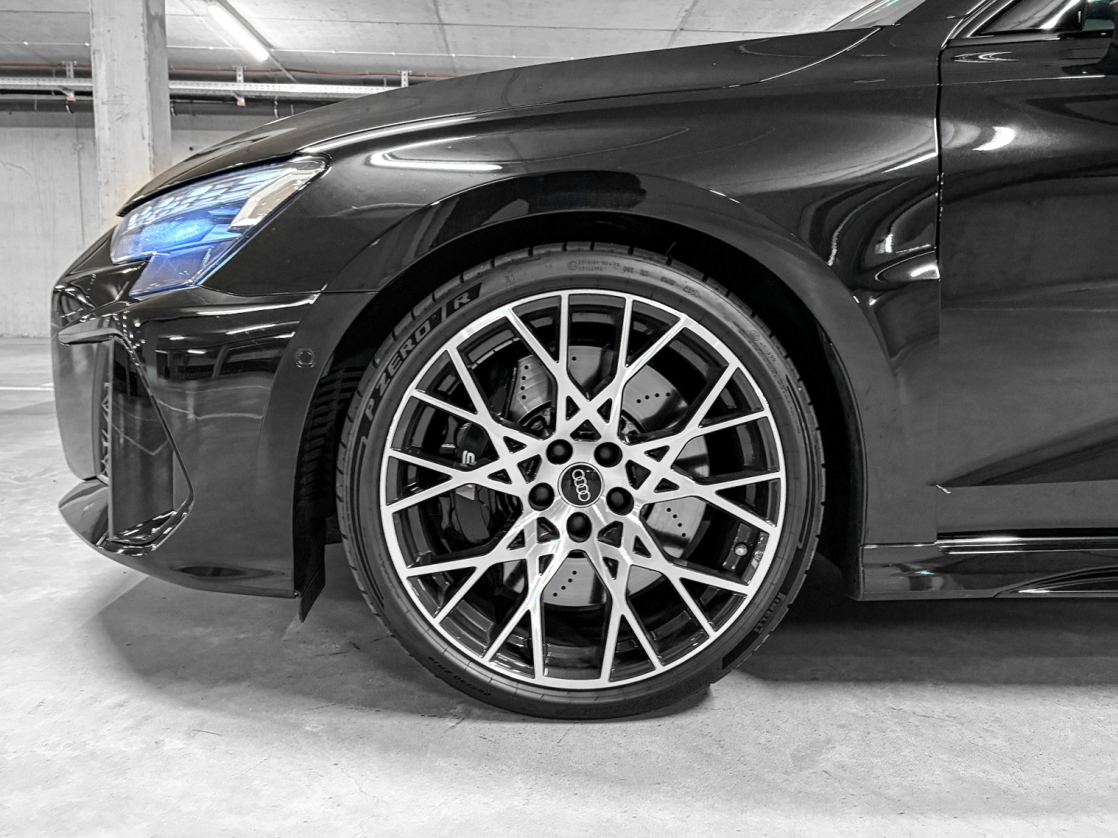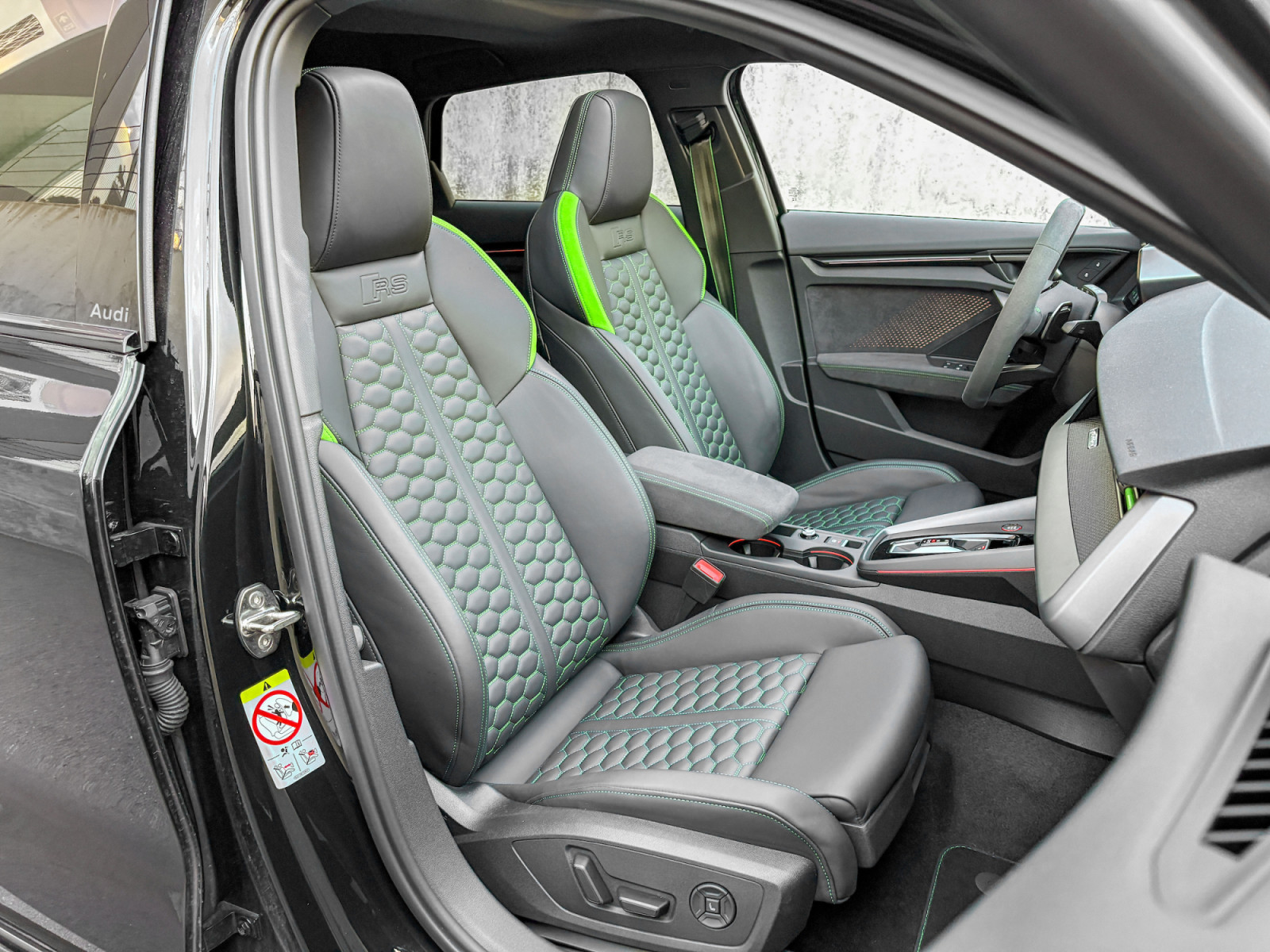 Pack d'assistance à la conduite et au stationnement étendu avec systèmes de protection et d'alerte plus pack d'assistance, Audi connect (services basés sur Internet), suspension Audi Drive Select + avec contrôle des amortisseurs (Magnetic Ride), rétroviseurs extérieurs couleur carrosserie, système mains libres Bluetooth avec reconnaissance vocale (Audi Phone Box), pack design : RS vert, étendu (plus), système d'assistance à la conduite : assistant de maintien, pare-brise avec verre athermique, couvercle de coffre à bagages électrique. actionné (ouverture + fermeture), vitesse maximale 280 km/h, intérieur : éléments intérieurs en microfibre Dinamica, pack climatisation plus, pack confort pro, supports lombaires avant, réglables pneumatiquement, avec fonction massage, jantes alliage avant/arrière : 9x19 / 8x19 (10 branches croisées, noir métallisé), phares à LED matriciels, peinture métallisée, cache-moteur carbone sigma, pack navigation, toit ouvrant panoramique électrique, système de surveillance de la pression des pneus, détection d'occupation des sièges pour les ceintures de sécurité, revêtement/garnissage des sièges : cuir Nappa fin, surpiqûres en nid d'abeille avec logo en relief sur les dossiers des sièges avant, système d'échappement sport, vitres arrière teintées (verre Privacy)