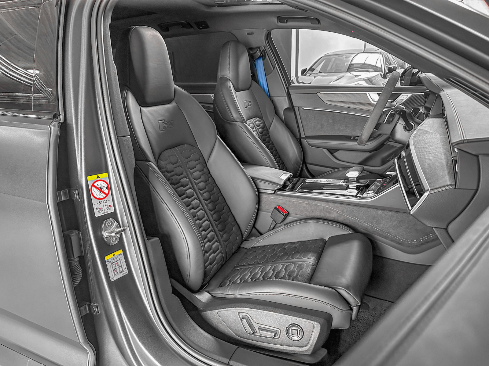 Pack Assistance Tour, anneaux et inscriptions Audi en noir brillant, rétroviseurs extérieurs électriques. réglable, chauffant et rabattable, avec atténuation automatique et mémoire, rétroviseur extérieur noir, système mains libres Bluetooth avec reconnaissance vocale (Audi Phone Box), pack design : RS blue, pack dynamique plus, système d'aide à la conduite : assistant de direction au stationnement, kit de fixation pour système de rails dans le coffre à bagages, pare-brise confort climatique/verre acoustique, chauffant, affichage tête haute, peinture mate individuelle, Audi exclusive, intérieur : applications décoratives en sergé de carbone, système de caméra vue d'ambiance (vue de dessus), système de freinage en céramique à l'avant et arrière, étriers de frein peints en bleu, combiné d'instruments numériques (cockpit virtuel plus) au design RS, clé confort avec déverrouillage du hayon commandé par capteur et système d'alarme antivol inclus (ouverture + fermeture), jantes LM 10,5x22 (5 rayons Y , noir, mat), phare matriciel à LED avec éclairage laser, optiques Pack Noir, toit panoramique électrique à l'avant, fixe à l'arrière, airbag latéral à l'avant et à l'arrière, verrouillage électrique des portes, revêtement de siège/revêtement : cuir Valcona perforé , matelassage en nid d'abeille, ventilé), système audio Bang & Olufsen, système d'échappement sport, chauffage d'appoint, vitrage arrière obscurci (vitrage privé), attache remorque électrique...