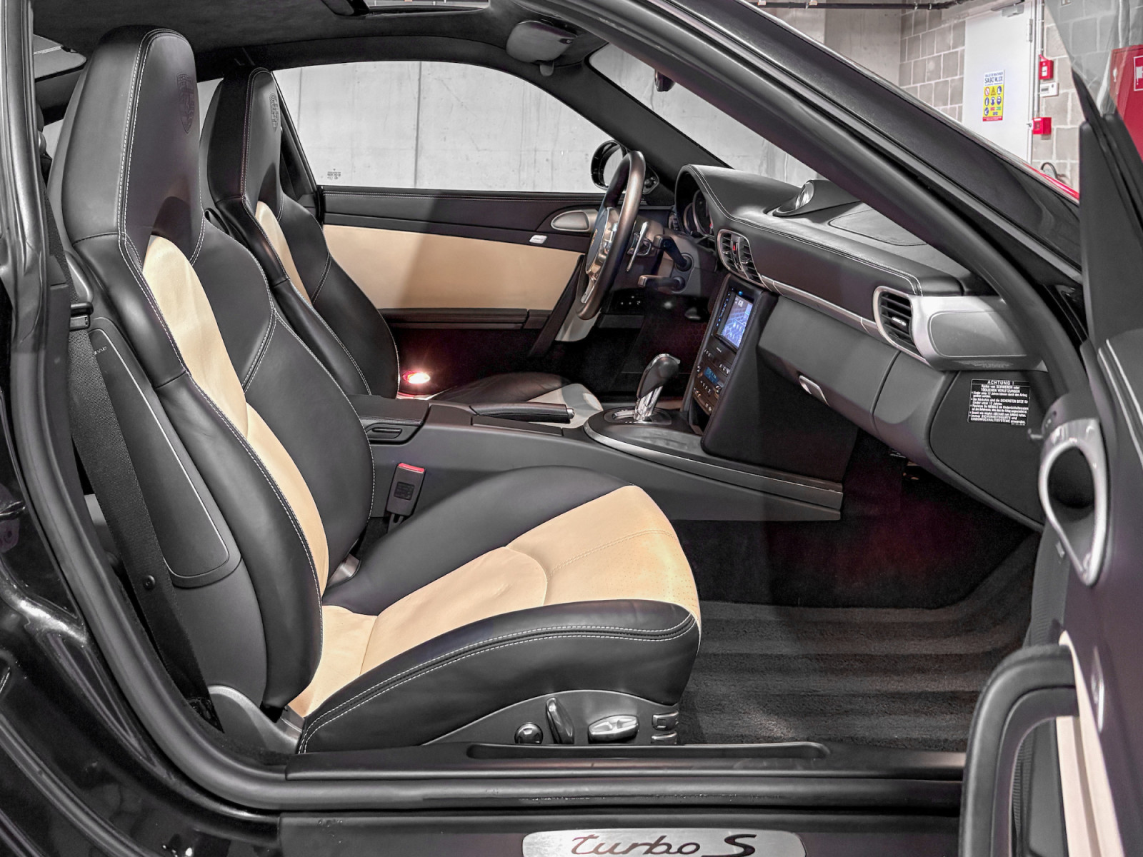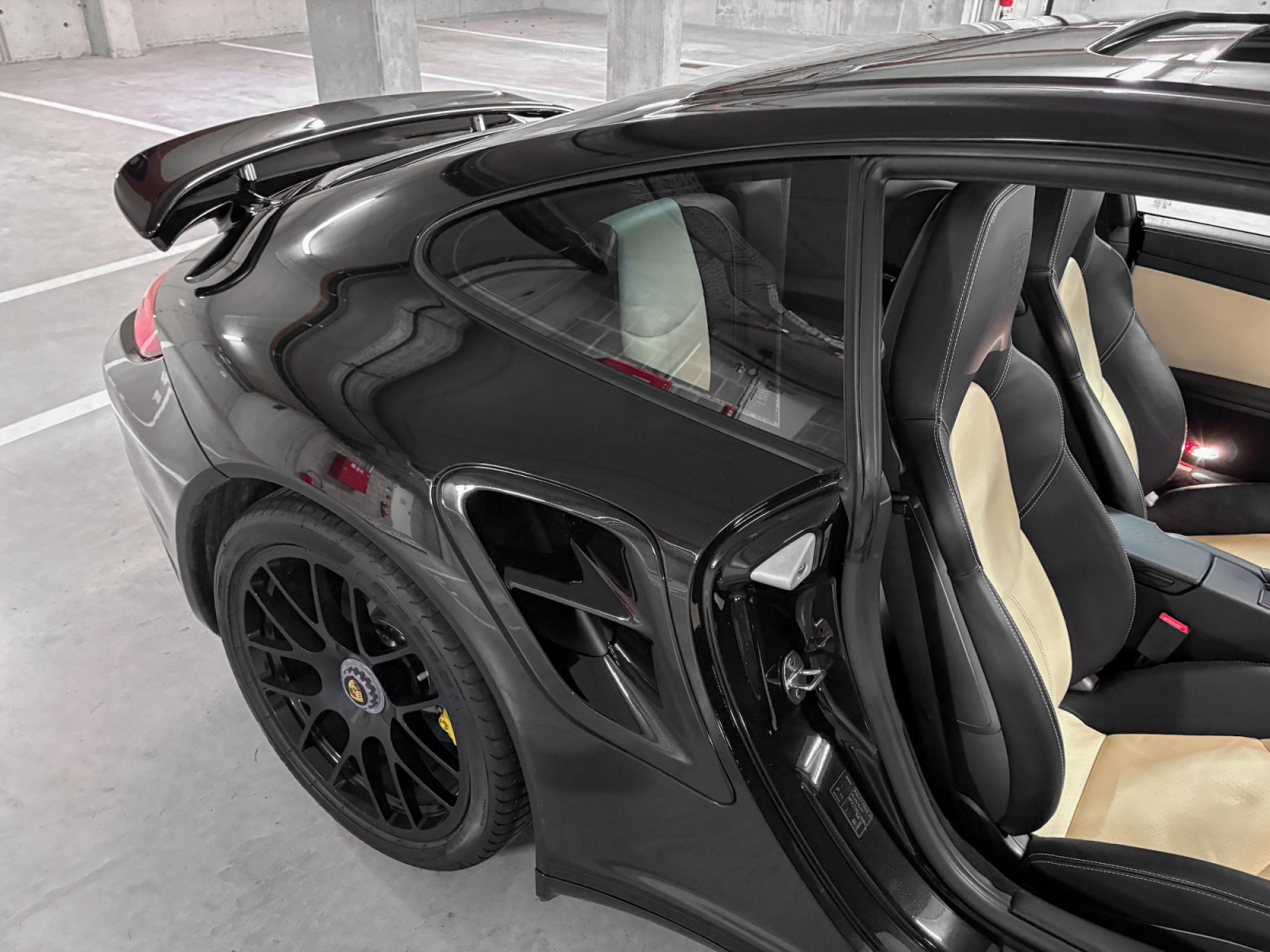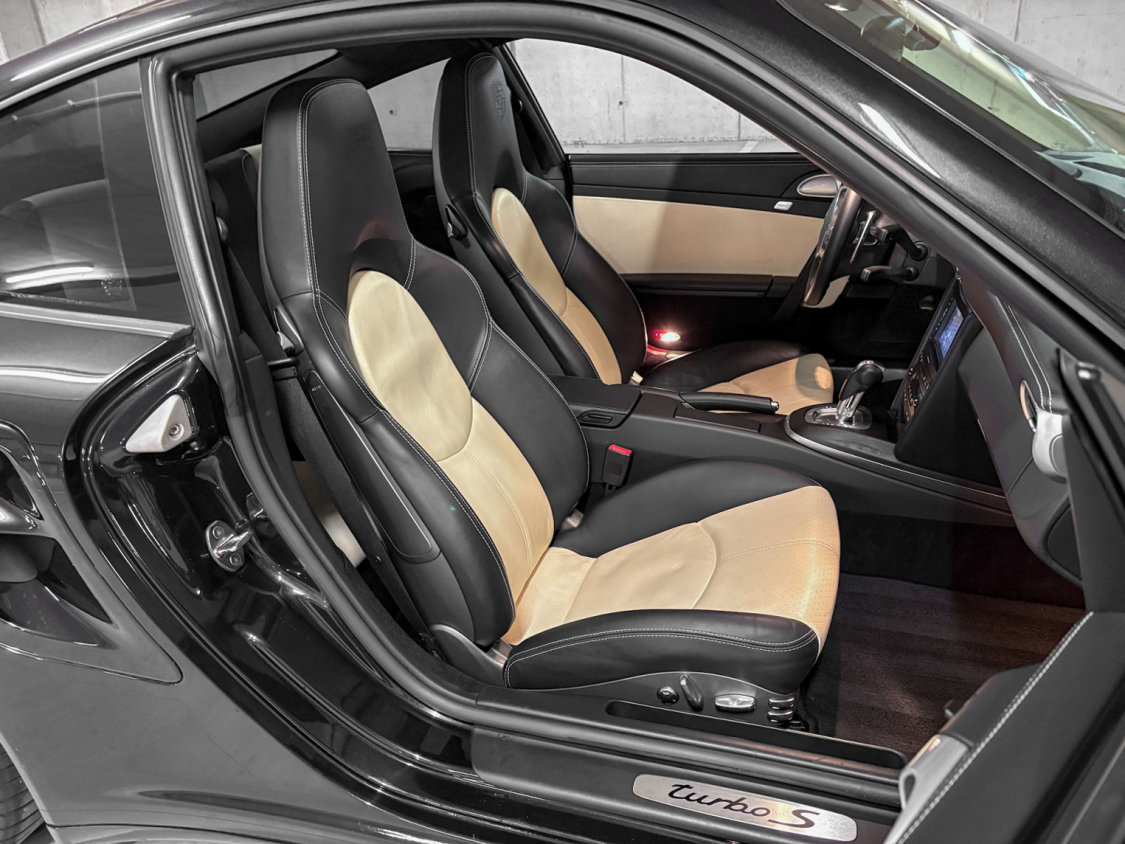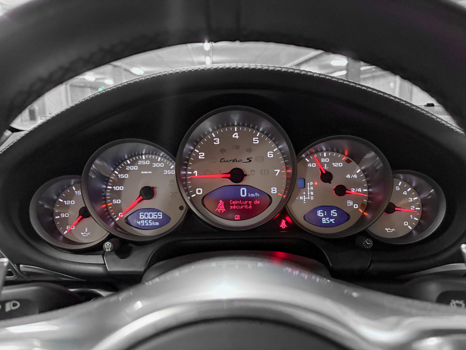 Rétroviseur extérieur/intérieur avec obscurcissement automatique et capteur de pluie, panneaux d'entrée (acier inoxydable), intérieur : cuir, jantes LM avant/arrière : 8,5x19 / 11x19 (roue Turbo II), peinture métallisée, console centrale arrière peinte, écouteur passif pour téléphone (PCM), système de surveillance de la pression des pneus, sièges avant chauffants, Sport Chrono Package Plus, bouchon de réservoir aspect aluminium, module téléphonique pour Porsche Communications Management (PCM), prééquipement pour système de localisation des véhicules