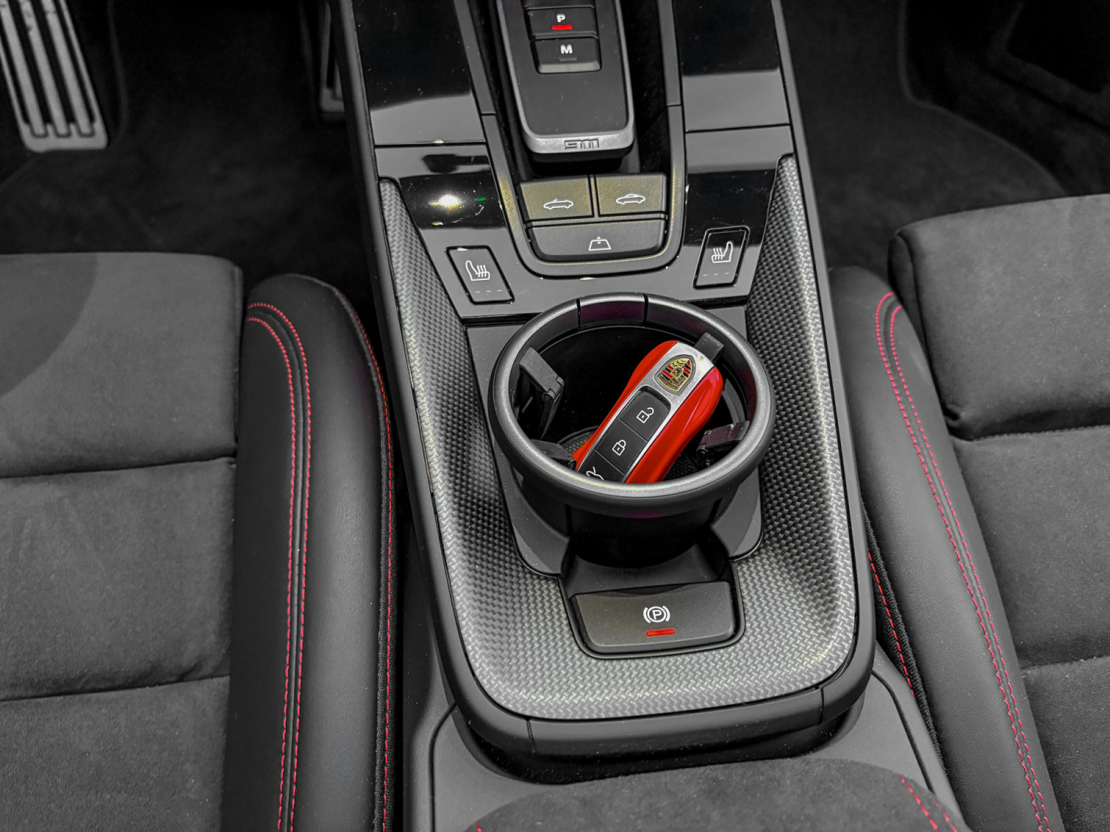 Écusson Porsche sur le couvercle du compartiment de rangement en Race-Tex - Porsche Exclusive Manufaktur