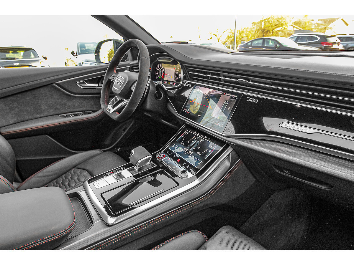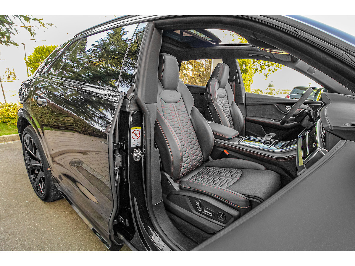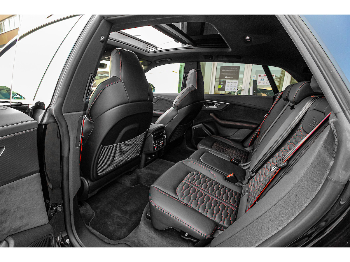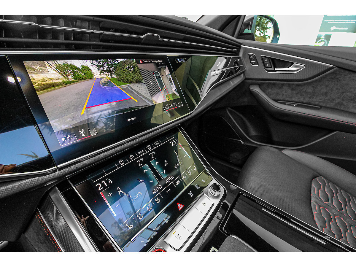 Pack d'assistance au stationnement, Pack d'assistance aux voyages, Interface smartphone Audi, Rétroviseurs extérieurs électriques, chauffants et rabattables avec fonction anti-éblouissement automatique et fonction mémoire, Antivol de roues, Affichage tête haute, Inserts décoratifs intérieurs : inserts en sergé de carbone, Fixations Isofix pour siège enfant sur le siège passager avant, Combiné d'instruments numérique (virtual cockpit plus) avec design RS, Jantes alliage 10,5 x 23 pouces (5 branches en Y, design rotor, noires), Phares Matrix LED, Peinture métallisée, Pack style aluminium mat, Toit ouvrant panoramique (électrique à l'avant, fixe à l'arrière), Système d'échappement sport RS, Fermeture assistée des portes, Sellerie cuir Valcona perforé avec surpiqûres en nid d'abeille et ventilation, Système audio Bang & Olufsen, Pare-chocs RS, Peinture intégrale, Vitres arrière surteintées Désactivation de l'airbag passager, airbags conducteur/passager, direction intégrale, Audi connect (services Internet), Audi connect (système d'appel d'urgence et d'assistance), Audi Drive Select, interface musicale Audi, commandes aspect verre avec inserts aluminium étendus, étriers de freins peints en noir, ciel de toit en tissu noir, aileron de toit RS, doubles pare-soleil (coulissants et extensibles), aide au stationnement avant, latérale et arrière, acoustique et visuelle avec affichage panoramique, seuils de porte éclairés avec incrustations et lettrage en aluminium, système d'assistance à la conduite : assistance au freinage (Audi pre sense front), système d'assistance à la conduite : système de protection des occupants (Audi pre sense basic), système d'assistance à la conduite : avertisseur de franchissement de ligne, système d'assistance à la conduite : reconnaissance des panneaux de signalisation, pare-brise athermique, clé télécommandée, tapis de sol en velours, véhicule sans barres de toit, cloison de séparation du coffre (filet), hayon électrique. Fonctionnement manuel (ouverture + fermeture), Pack Brillant, Intérieur : Éléments intérieurs en cuir (partie supérieure et inférieure), Rétroviseur intérieur à atténuation automatique, Ioniseur pour la purification de l'air (Système de qualité de l'air), Fixations Isofix pour sièges enfant, Carrosserie : 4 portes Climatisation automatique 4 zones, pack éclairage d'ambiance, airbags latéraux de tête, protection de seuil de chargement en acier inoxydable, colonne de direction à réglage électrique, hybride léger 441 kW (moteur V8 32V TFSI 4,0 L), système multimédia MMI Navigation Plus avec MMI Touch, pack non-fumeur, filtre à particules pour moteurs essence (FAP), frein de stationnement électromécanique, pédales et repose-pied en acier inoxydable, radio numérique terrestre (DAB), empattement de 2 998 mm, kit de réparation de pneus, système de surveillance de la pression des pneus, banquette arrière rabattable et coulissante (40/20/40), faibles émissions selon la norme Euro 6d, gicleurs de lave-glace chauffants, airbags latéraux avant, sièges avant à réglage électrique (avec mémoire), sièges avant chauffants, suspension sport (suspension pneumatique adaptative), système Start/Stop, pare-chocs avant, interface Bluetooth universelle, système d'accès et de démarrage sans clé