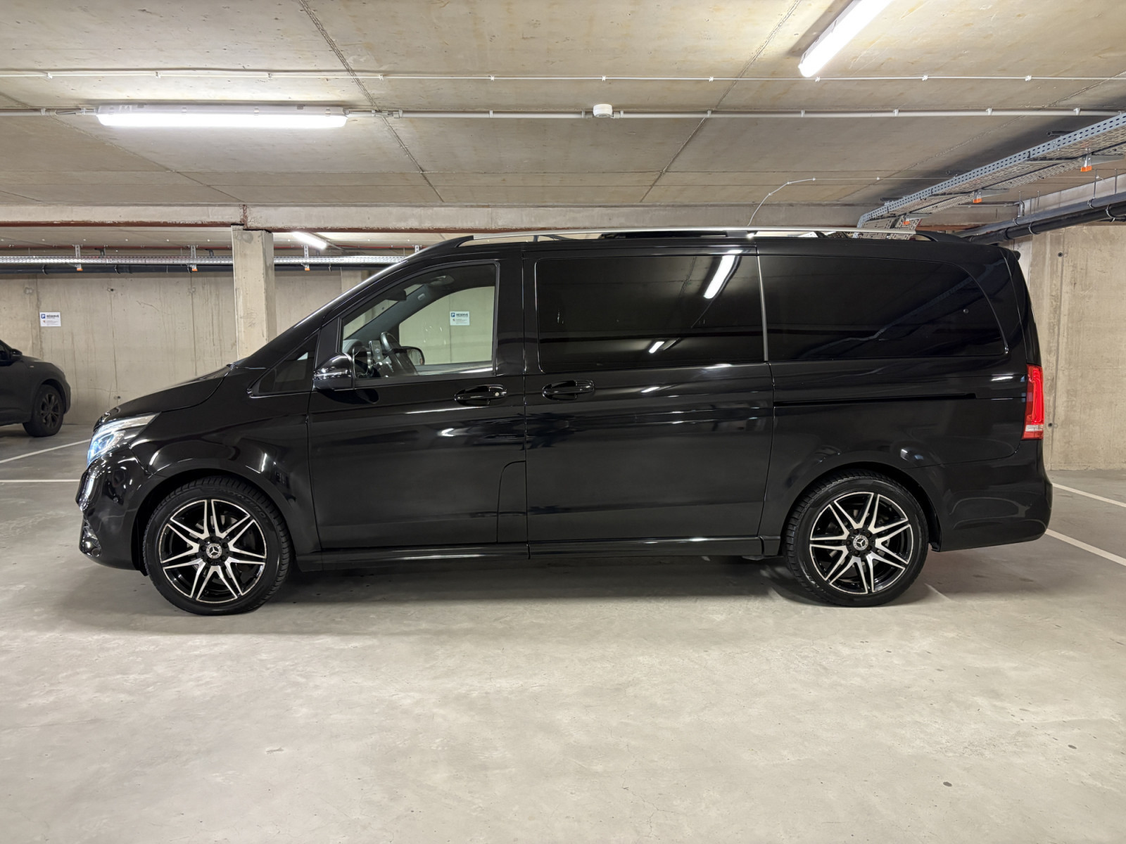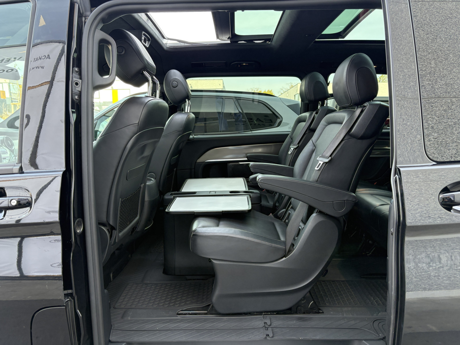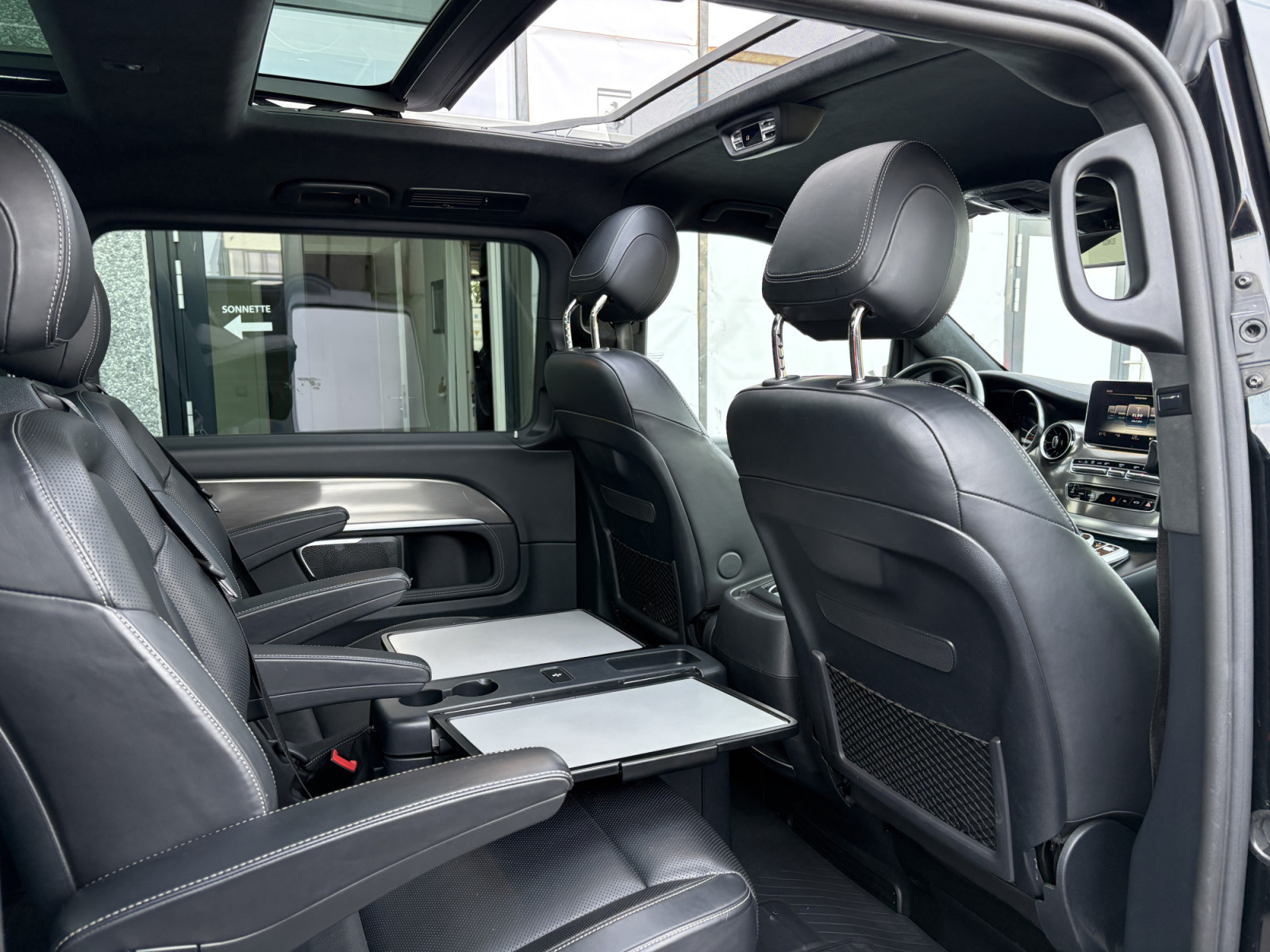 Filet de rangement sur le dossier du siège avant gauche, feu stop adaptatif, airbag passager, airbag conducteur, éclairage d'ambiance, aide au démarrage en côte, attelage de remorque : branchement électrique pour prise de remorque, transmission intégrale, indicateur de niveau de liquide lave-glace, partie supérieure du tableau de bord en similicuir, accoudoirs d'habitacle, rétroviseurs extérieurs asphériques, rétroviseurs extérieurs électriques. Réglables et chauffants, tous deux, rétroviseurs extérieurs avec clignotants intégrés, affichage de la température extérieure, éclairage de la poignée de maintien arrière avec spot de lecture, pack BlueEfficiency, revêtement de sol : moquette dans l'habitacle, revêtement de sol : moquette dans l'espace de chargement/passagers, assistance au freinage, système de freinage avec ABS+ASR, ciel de toit Dinamica noir, ligne d'équipement Exclusive, pack design intérieur, direction directe avec assistance variable à la direction, allumage automatique des phares, poignée d'accès arrière, seuils de porte avec inscription Mercedes-Benz (éclairés), éclairage d'accès, Exclusive, système d'assistance à la conduite : Attention Assist (capteur de détection de somnolence), système d'assistance à la conduite : Highbeam Assistant Plus, système d'assistance à la conduite : Gestion de panne, système d'assistance à la conduite : Crosswind Assist, système d'assistance à la conduite : Traffic Sign Recognition, vitres des portes arrière/hayon avec système d'essuie-glace/lave-glace, vitre dans le compartiment de chargement/FG : - fixe, avant gauche, vitre dans le compartiment de chargement/FG : - fixe, avant droite, frein de stationnement électrique, verrouillage des portes coulissantes (actif), boîte de vitesses automatique GTronic - (9 vitesses), prétensionneur de ceinture, poignées de maintien à l'arrière, boîte à gants verrouillable, réservoir d'urée (AdBlue) : 24 Ltr., hayon avec système d'ouverture et de fermeture automatique, lunette arrière ouvrante, lunette arrière chauffante, Intelligent Light System LED, carrosserie/structure : bus, carrosserie/structure : longue, verrouillage de sécurité enfant, climatisation arrière automatique (Tempmatik), combiné d'instruments avec écran couleur, climatisation automatique Thermotronic comfort, éclairage de confort dans l'habitacle/l'espace de chargement, module de communication Mercedes me connect (services basés sur Internet), système d'airbag de tête (window bag), airbag tête-épaule (thorax bag) côté conducteur/passager, volant (colonne de direction réglable mécaniquement), volant multifonction avec ordinateur de bord, réglage de la portée des phares, système d'appel d'urgence Mercedes-Benz, peinture métallisée, console centrale avec compartiment réfrigéré, mise à jour du modèle, moteur 2,0 Ltr. - 176 kW CDI KAT, système de navigation pour système multimédia MBUX, toit ouvrant panoramique à l'avant, électrique, avec toit panoramique à l'arrière, pack stationnement avec caméra 360°, immatriculation voiture de tourisme, chauffage PTC, empattement 3200 mm, système de surveillance de la pression des pneus, rétroviseur intérieur, faibles émissions selon la norme antipollution Euro 6d-TEMP, essuie-glaces avec capteur de pluie, porte coulissante pour le compartiment de chargement/passagers à gauche, porte coulissante à gauche, porte coulissante électrique à droite, équipement des sièges : système de siège enfant Isofix, équipement des sièges : mécanisme de fixation rapide pour système de rails de siège, housse de siège/rembourrage : cuir Nappa, sièges de la cabine de conduite : sièges conducteur et passager avant avec climatisation, sièges de la cabine de conduite : siège conducteur avec commande électrique. réglable (avec mémoire), sièges dans la cabine du conducteur : siège conducteur avec soutien lombaire, sièges dans le compartiment de chargement/véhicule : 1re rangée, 1 siège simple à gauche, sièges dans le compartiment de chargement/véhicule : 1re rangée, 1 siège simple à droite, sièges dans le compartiment de chargement/véhicule : 1re rangée, sièges arrière climatisés, pare-soleil avec rétroviseurs (éclairés), pack rétroviseurs, pack sport extérieur, prise (connexion 12 V) dans le compartiment de chargement/passagers, pare-chocs peints/bandes de pare-chocs latérales + poignée sur le hayon, système d'encadrement Burmester, vitres arrière teintées/verre noir, batterie polaire 92 Ah, préparation pour système de navigation (pour système multimédia MBUX), conduit d'air chaud vers le compartiment de chargement/passagers, affichage de l'intervalle d'entretien Assyst, vitrage isolant thermique