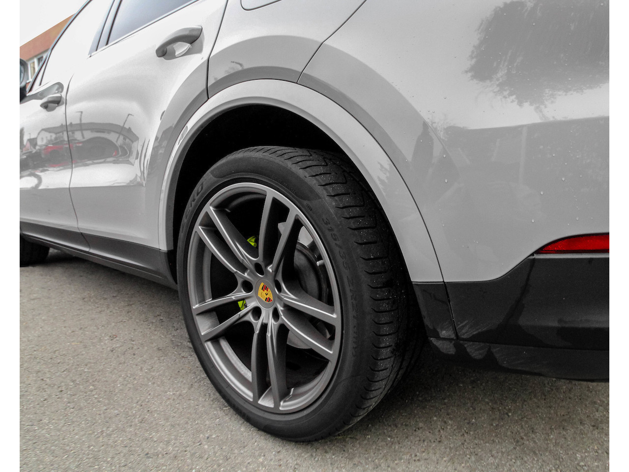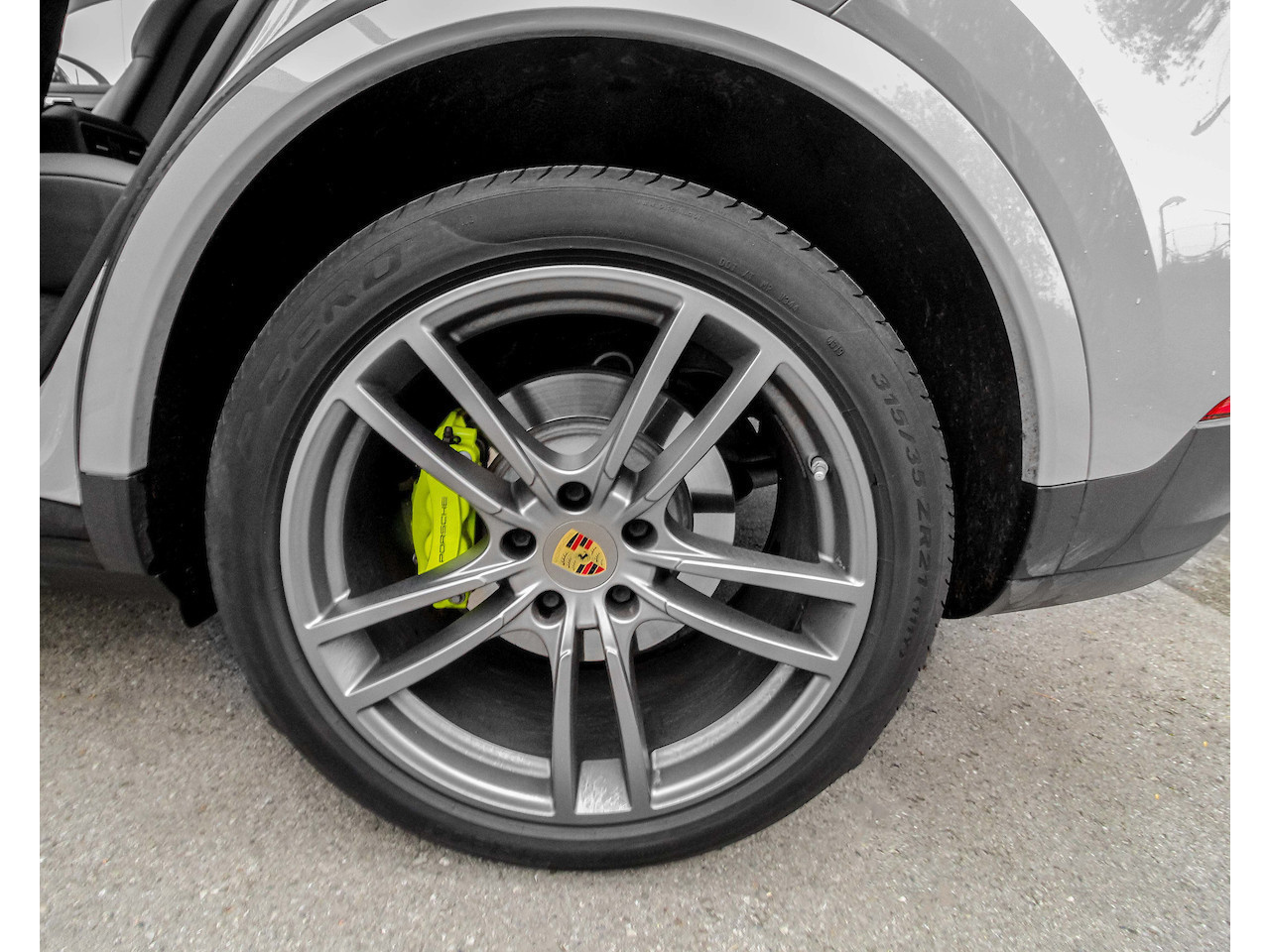 Eclairage d'ambiance, pack extérieur, extincteur, tapis de sol, véhicule sans nom de modèle, câble de charge avec prise industrielle (32 A/400 V), jantes LM avant/arrière : 9.5x21/11x21 (roue Cayenne Turbo Design, platine, couleur carrosserie , finition brillante satinée), Porsche Active Suspension Management (PASM), réception radio numérique (DAB +), moyeux de roue - blason Porsche coloré, Vehicle Tracking System Plus (PVTS Plus), vitrage arrière foncé (vitrage privé)