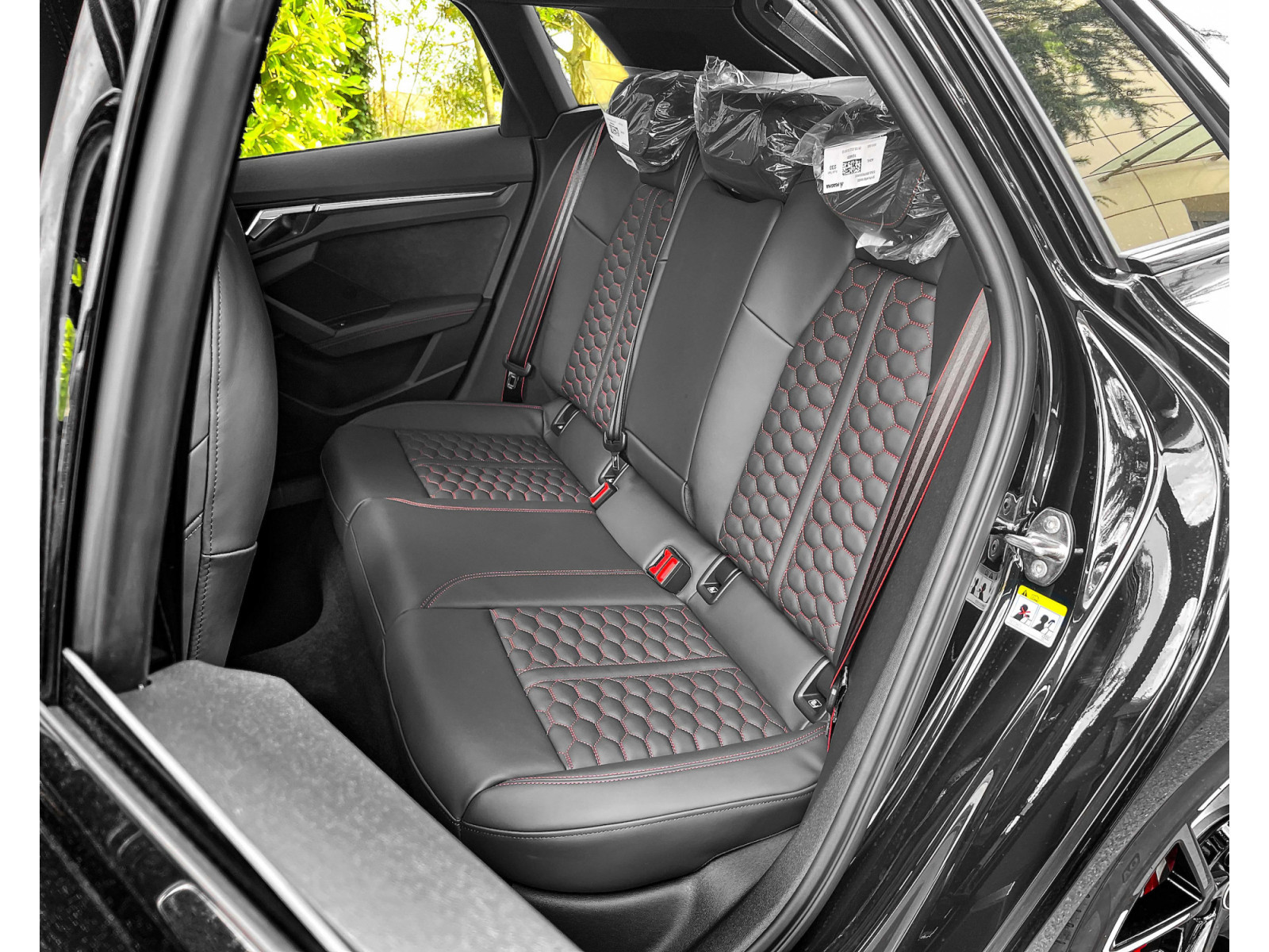 Audi connect (services basés sur Internet), Audi Drive Select + suspension avec commande d'amortissement (Magnetic Ride), interface smartphone Audi, électr. réglables, chauffants et rabattables, avec atténuation automatique et bordure automatique, rétroviseurs extérieurs couleur carrosserie, système mains libres Bluetooth avec reconnaissance vocale (Audi Phone Box), étriers de frein peints en rouge, pack design : rouge RS, étendu (plus), anti- antivol pour les roues (verrous de jante), système d'assistance à la conduite : système de protection des occupants (Audi pre sense basic), vitrage à isolation thermique du pare-brise, affichage tête haute, rétroviseur intérieur à atténuation automatique, clé confort avec déverrouillage du hayon commandé par capteur et anti-vol - système d'alarme antivol, volant (cuir - 3 branches) avec multifonction plus et fonction de commutation, jantes LM avant/arrière : 9x19 / 8x19 (5 rayons Y, noir avec impression graphique), phares à matrice LED, peinture métallisée, pack optique noir plus, toit ouvrant panoramique électrique, pack extérieur RS noir brillant, caméra de recul, sièges avant chauffants, système audio Bang & Olufsen, système d'échappement sport, interface USB pour les passagers arrière, vitrage arrière assombri (vitrage d'intimité), balances élévateur